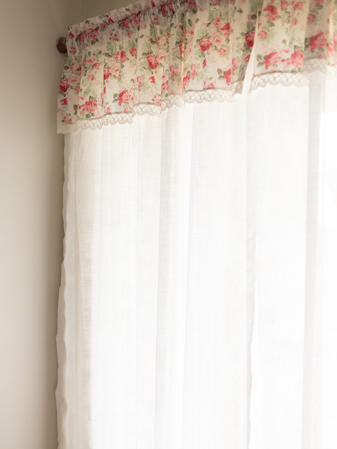 Pattern : White Sheer with floral ruffles attached to the top part of the white sheer curtain