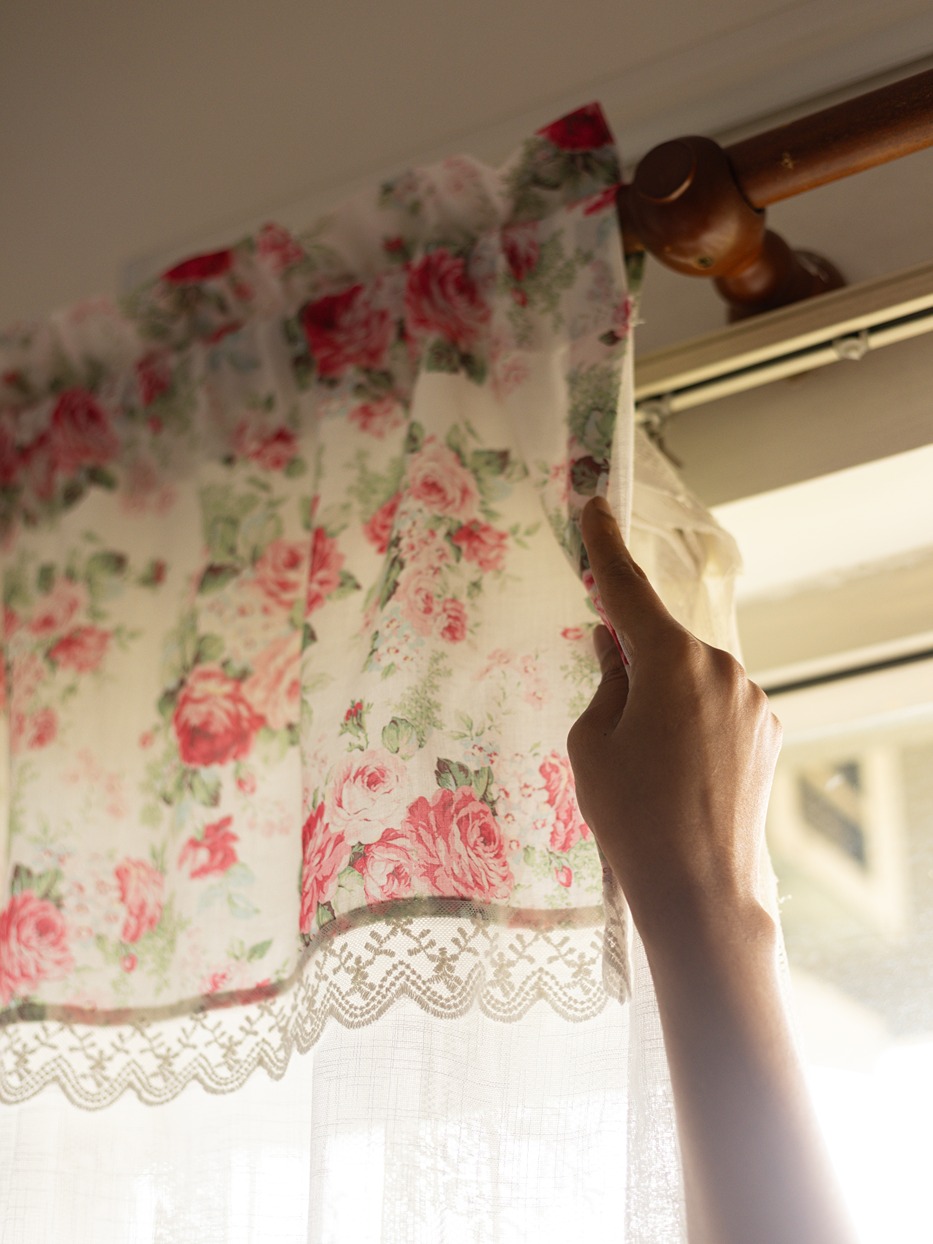 Add a touch of charm to your space with our handcrafted curtains featuring floral and lace detailing.