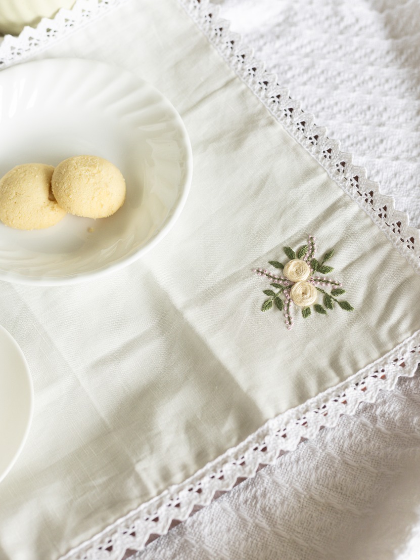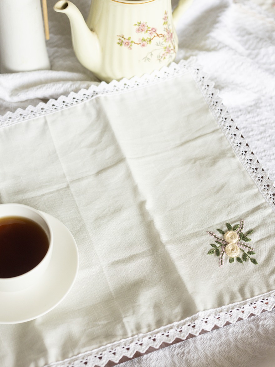 Style: Hand embrodiered on ONE corner of the tray cloth