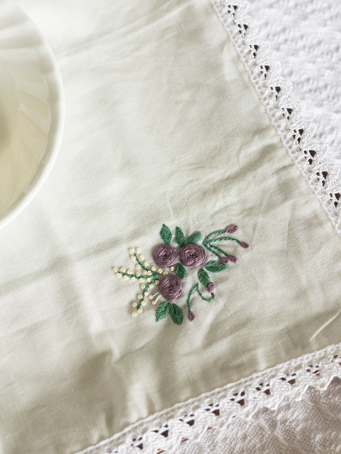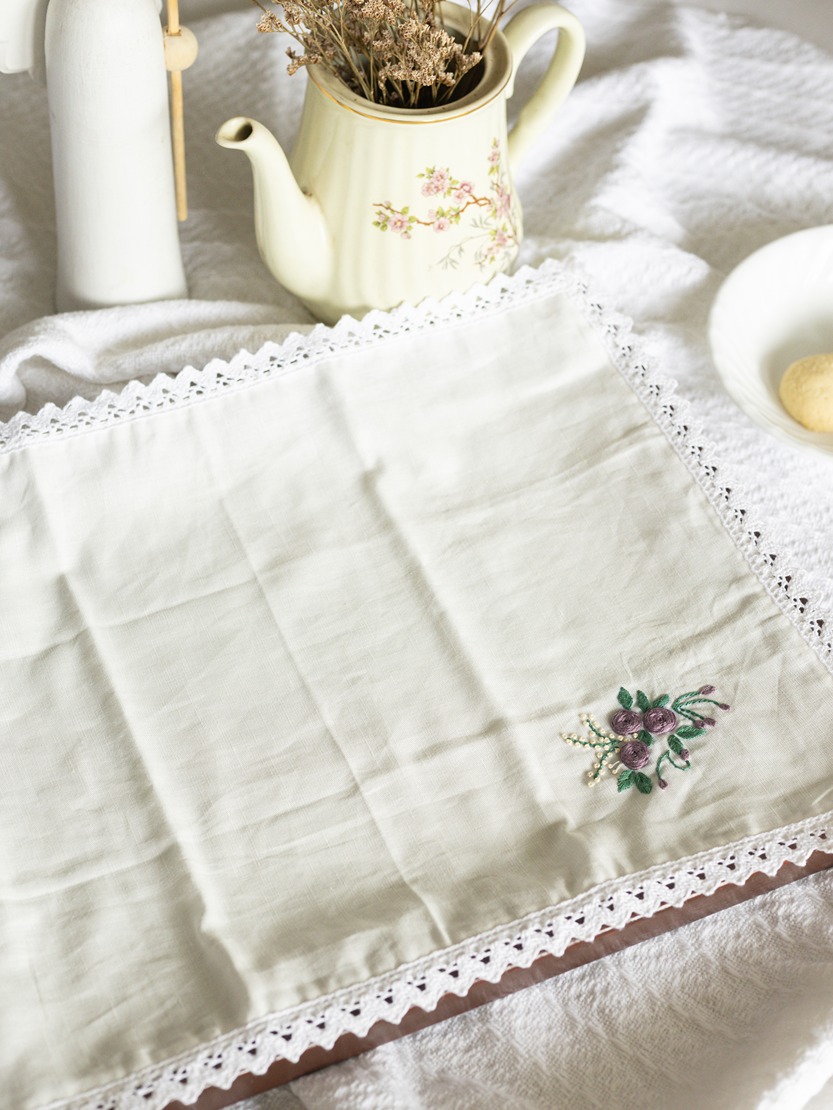 Style: Hand embrodiered on ONE corner of the tray cloth