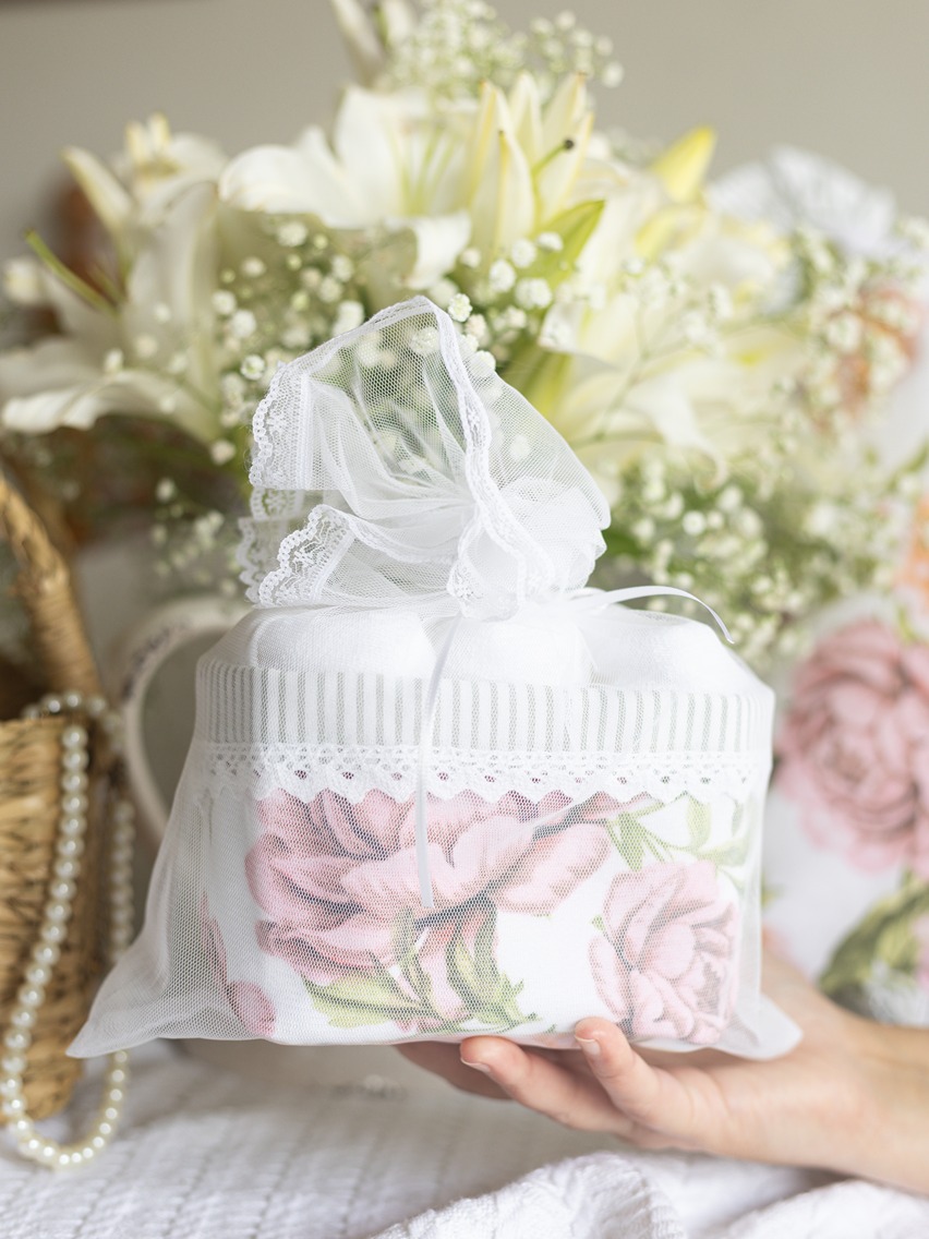 Care instructions: Gentle machine was for face towels and dry clean for fabric baskets. Do Not Bleach, Iron on low heat (not on laces and embroidery)