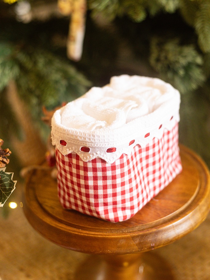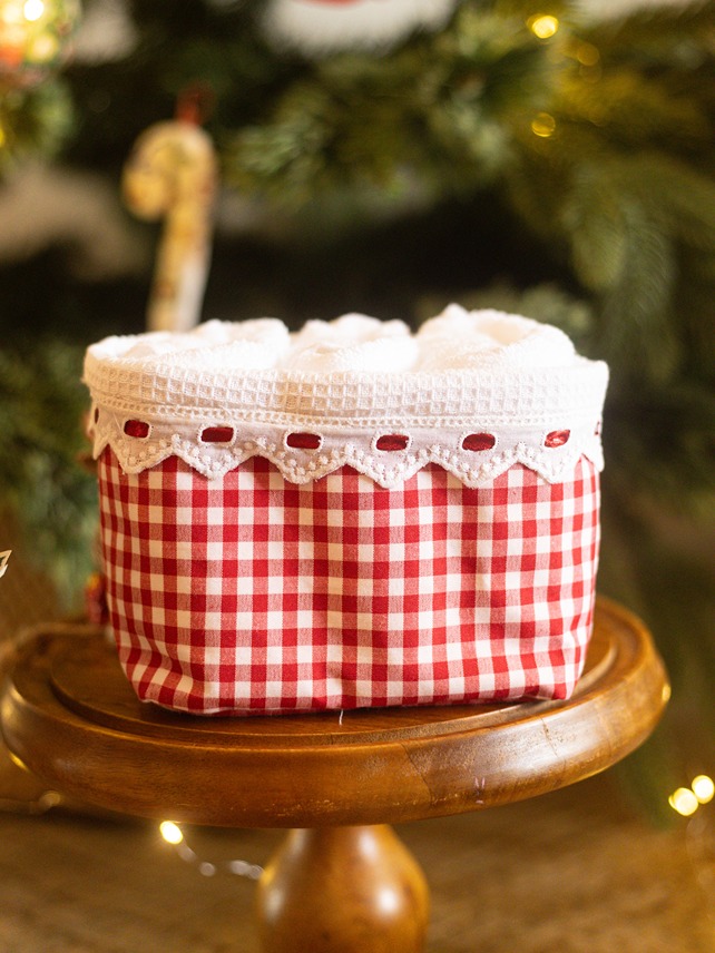 Care instructions: Gentle machine was for face towels and dry clean for fabric baskets. Do Not Bleach, Iron on low heat (not on laces and embroidery)