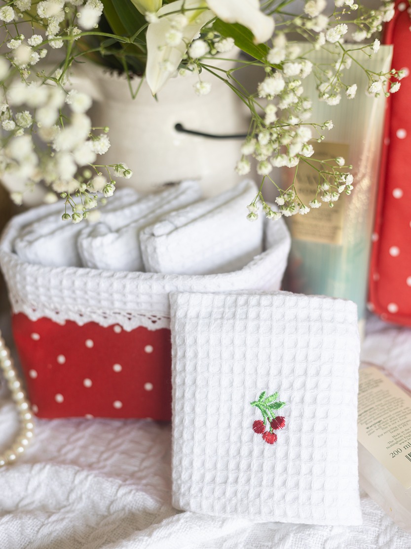 Care instructions: Gentle machine was for face towels and dry clean for fabric baskets. Do Not Bleach, Iron on low heat (not on laces and embroidery)