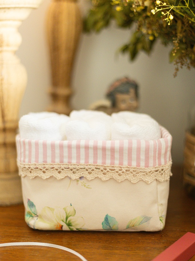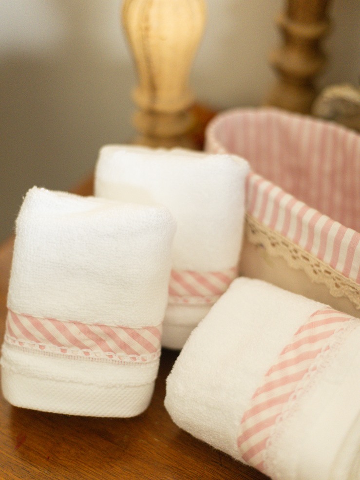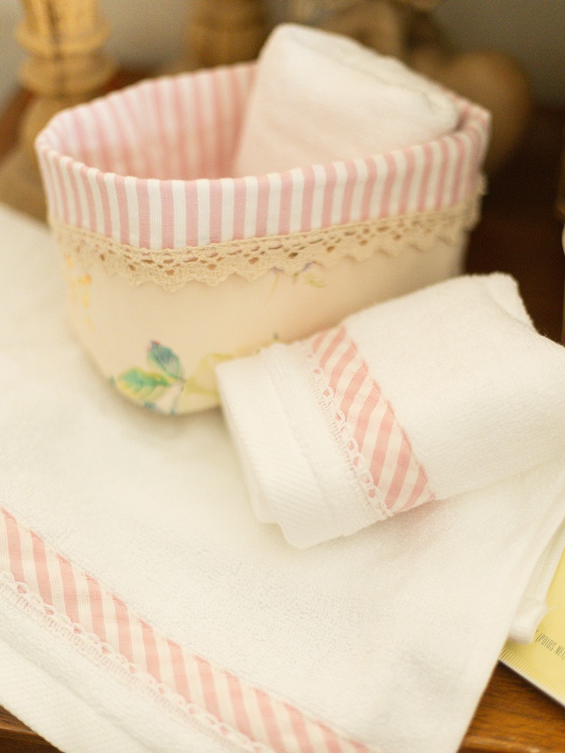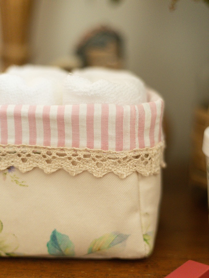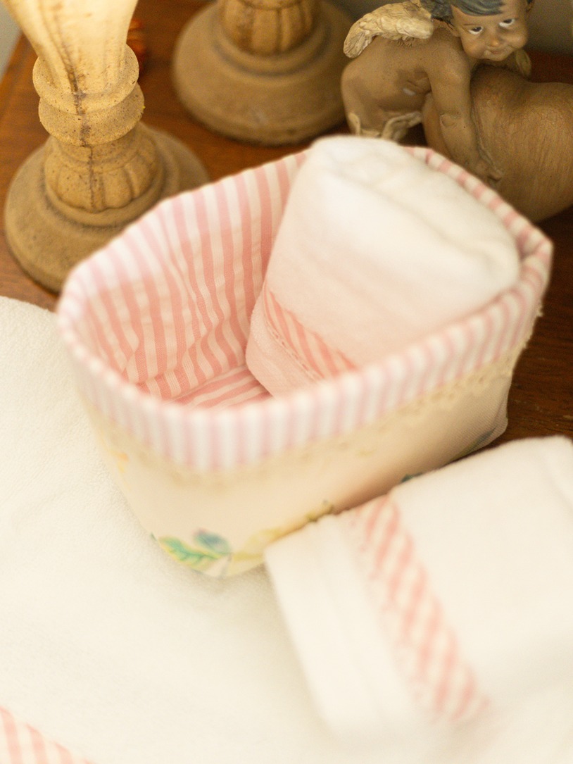 Care instructions: Gentle machine was for face towels and dry clean for fabric baskets. Do Not Bleach, Iron on low heat (not on laces and embroidery)