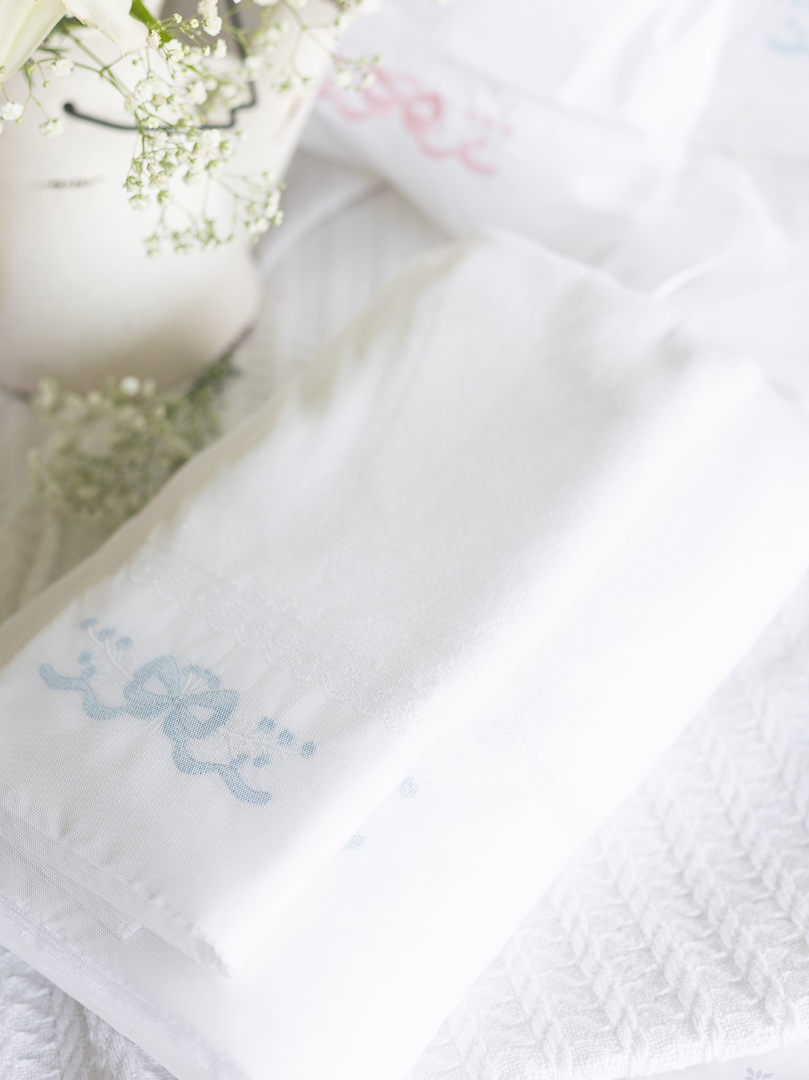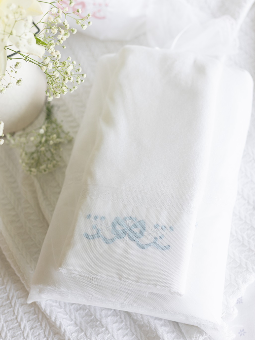 Soft cotton bath and hand towel set, with embroidery and lace detailing on one end of the towel. Wrap yourself in luxury and pamper yourself.