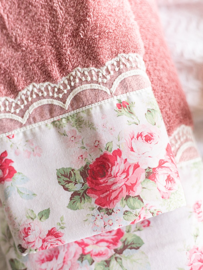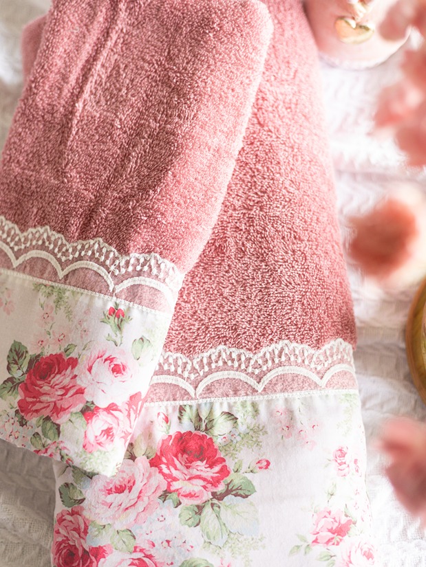 Soft cotton bath and hand towel set, with floral and lace detailing on one end of the towel. Wrap yourself in luxury and pamper yourself.