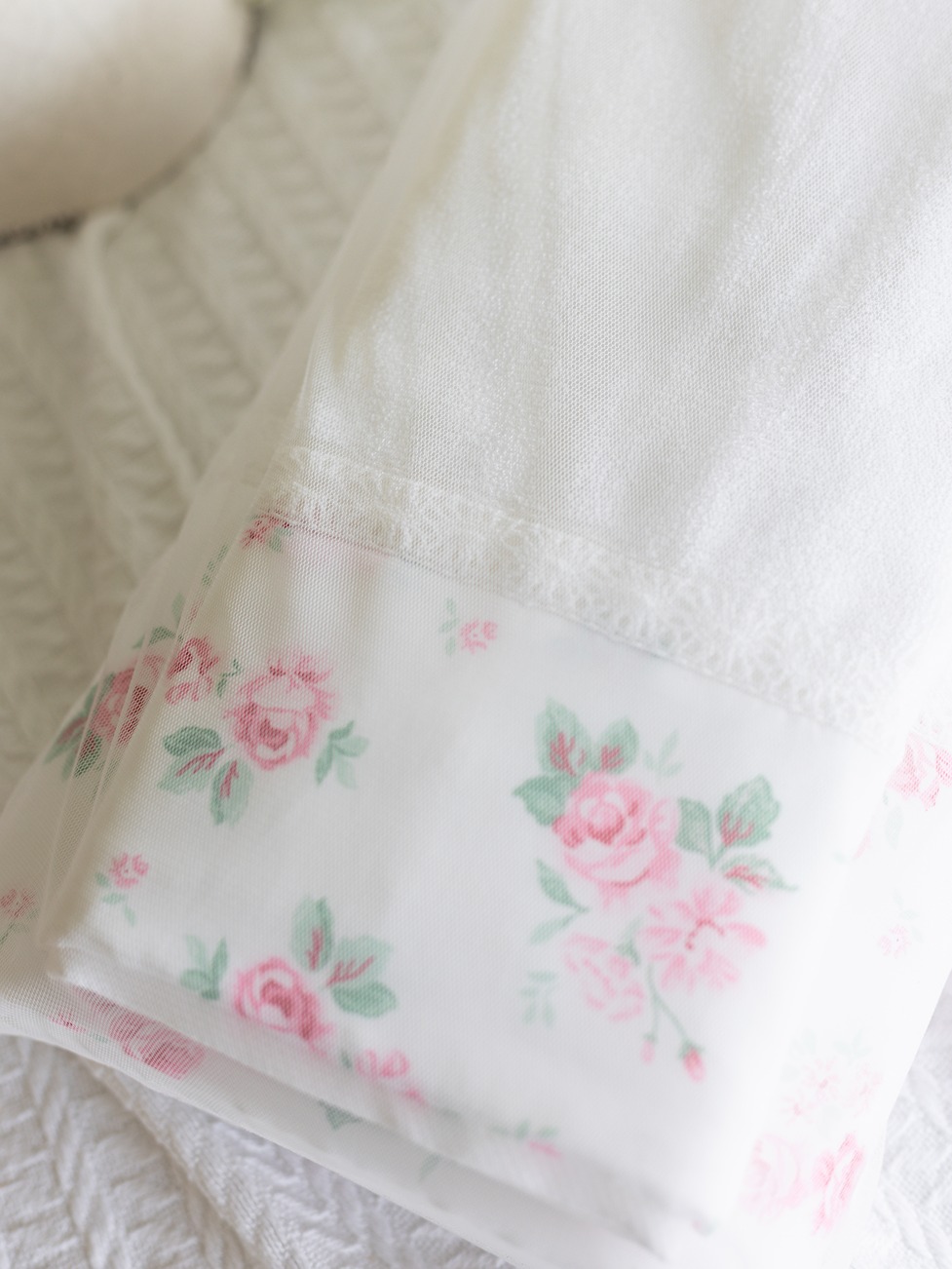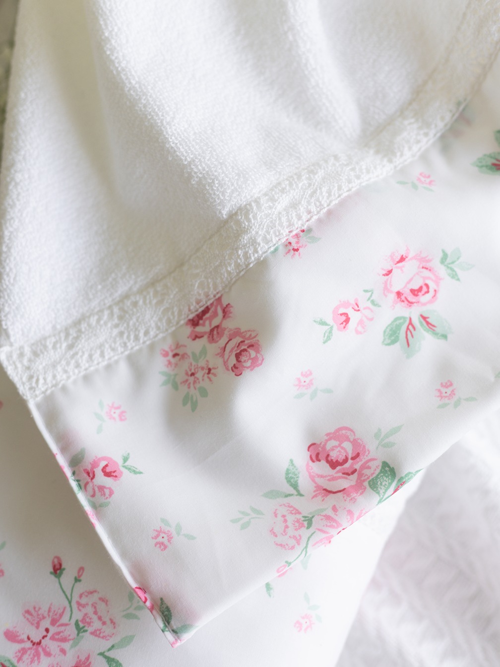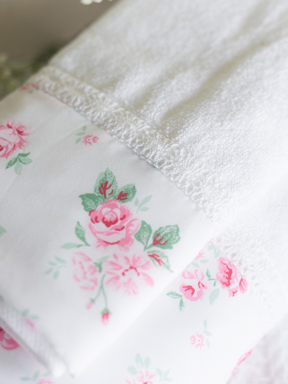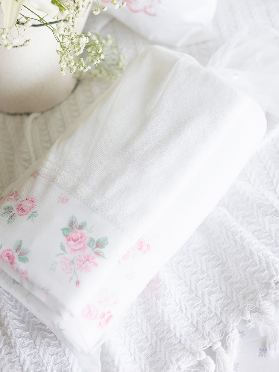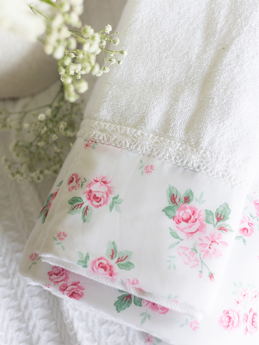 Soft cotton bath and hand towel set, with floral and lace detailing on one end of the towel. Wrap yourself in luxury and pamper yourself.