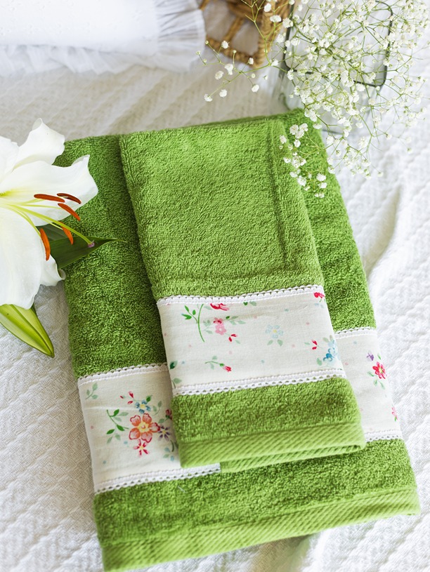Soft cotton bath and hand towel set, with floral and lace detailing on one end of the towel. Wrap yourself in luxury and pamper yourself.