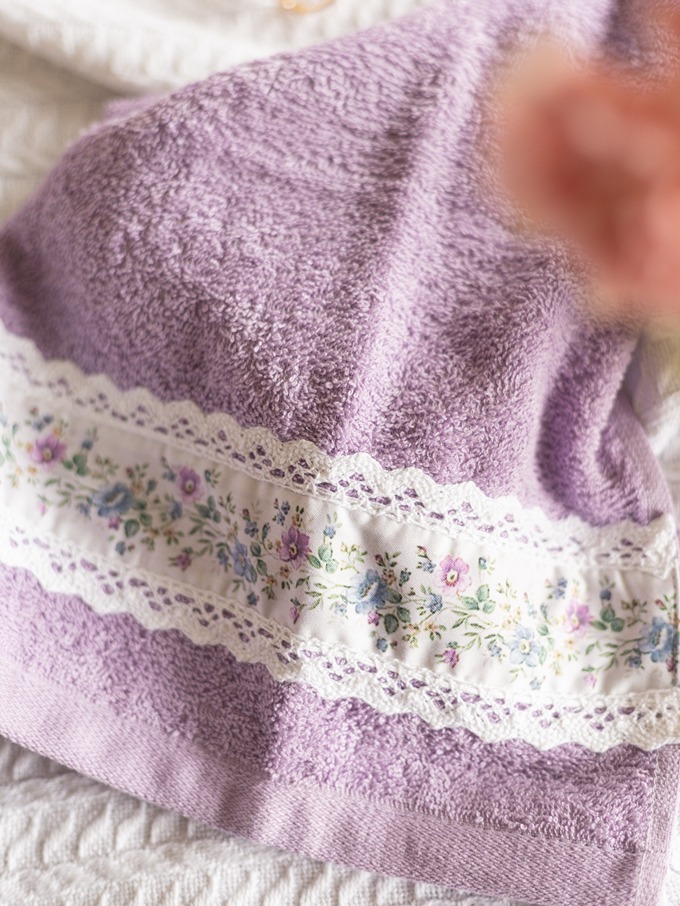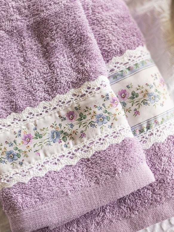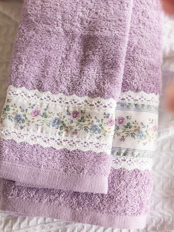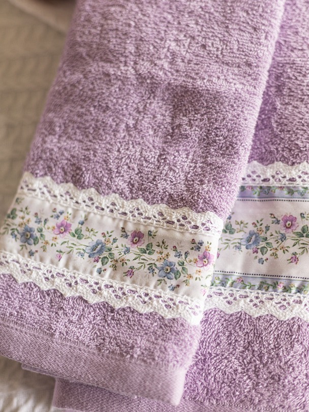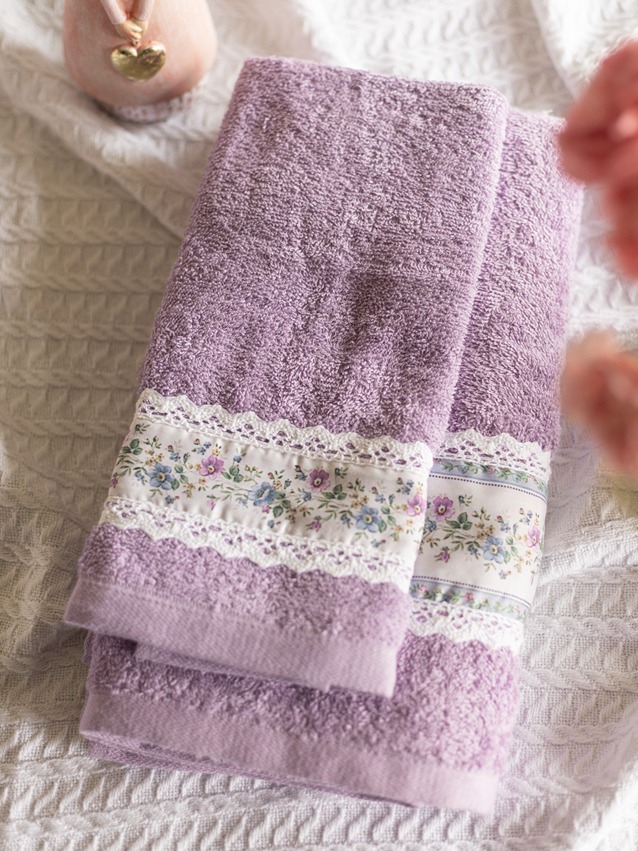 Soft cotton bath and hand towel set, with floral and lace detailing on one end of the towel. Wrap yourself in luxury and pamper yourself.