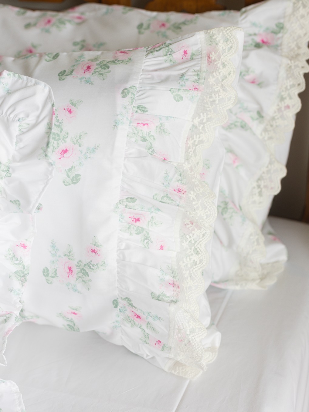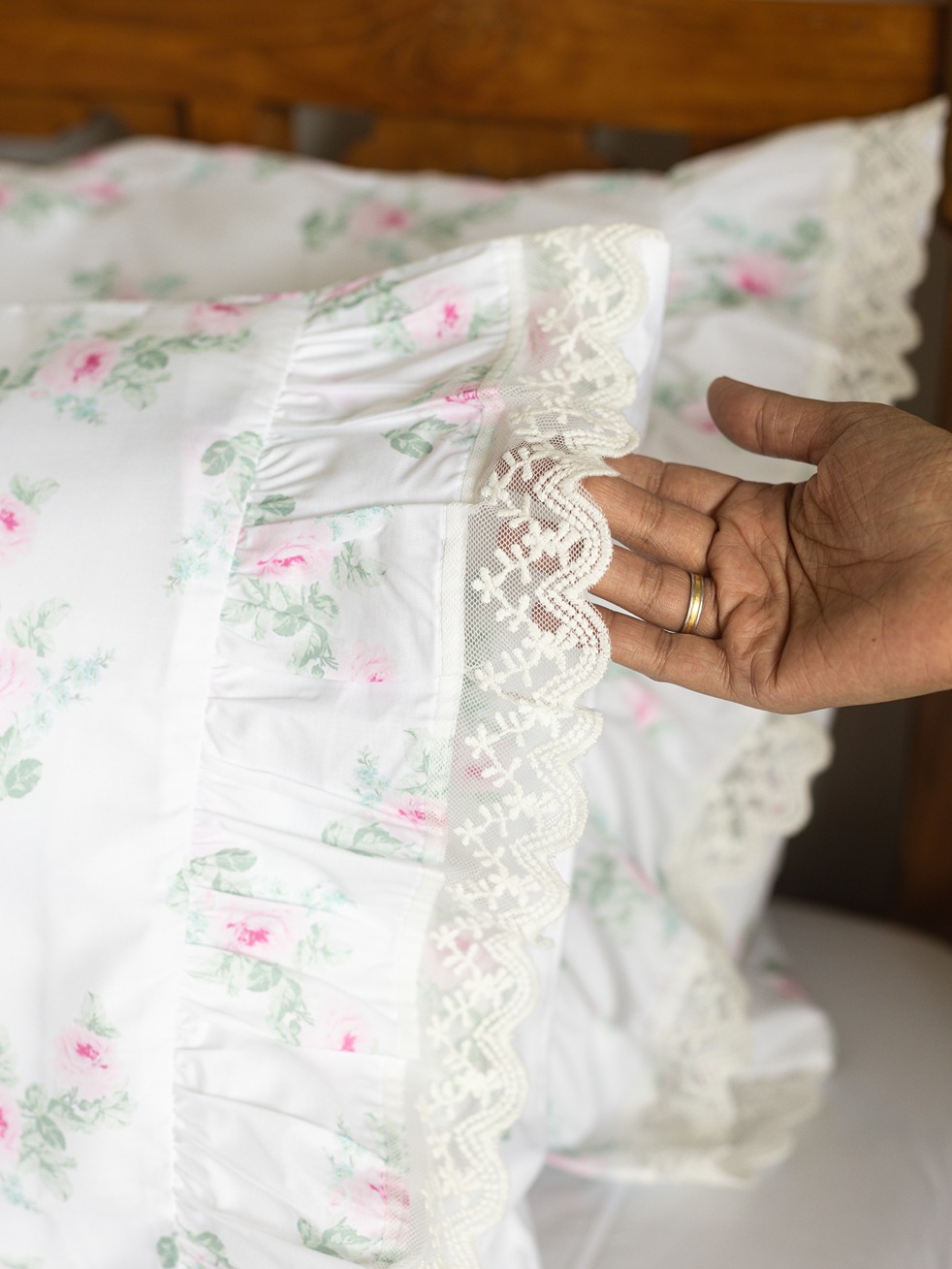 The set includes 1 white bedsheet with patchwork and lace detailing + 2 pillow covers ruffle and lace detailing.