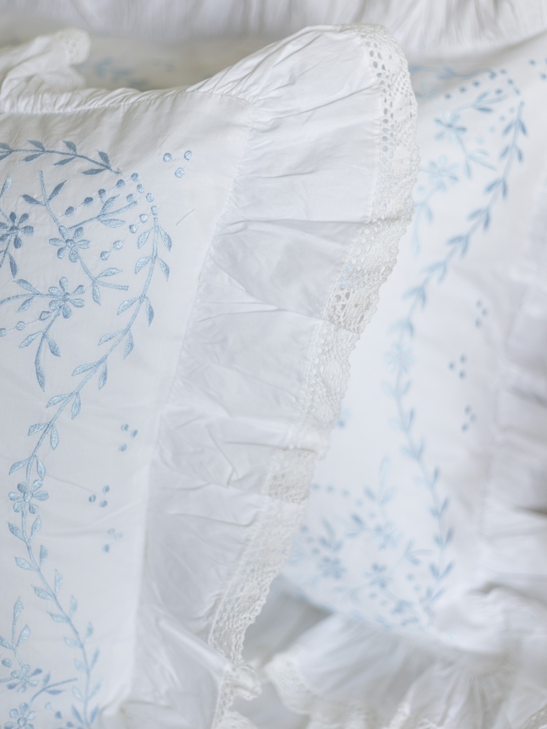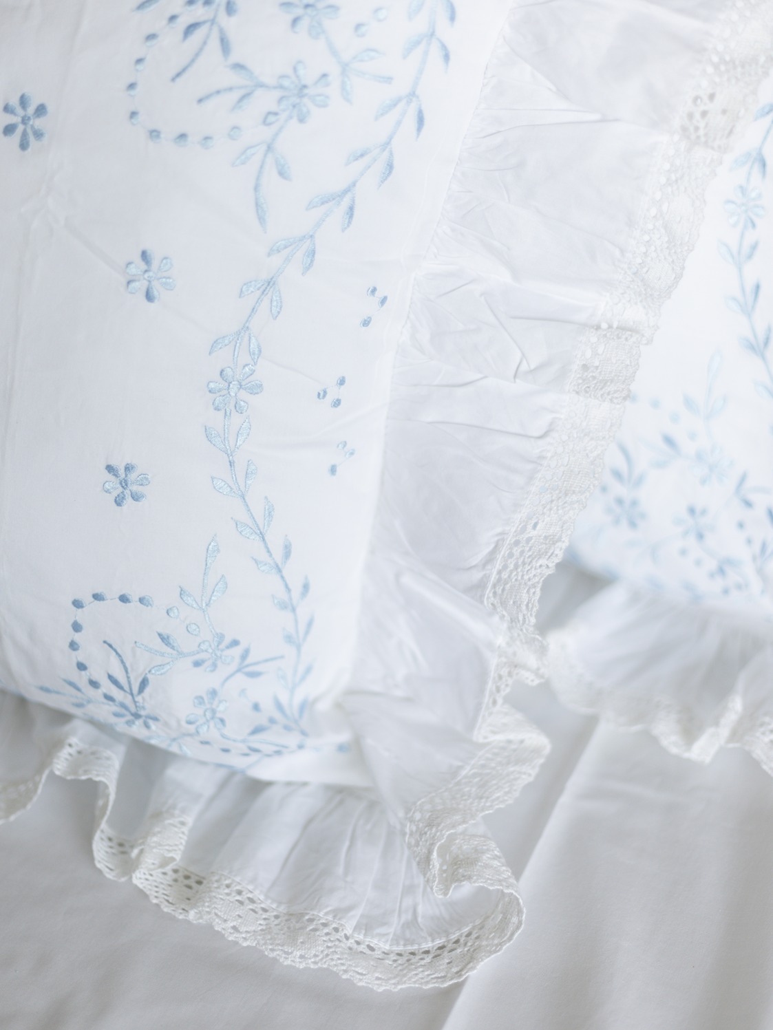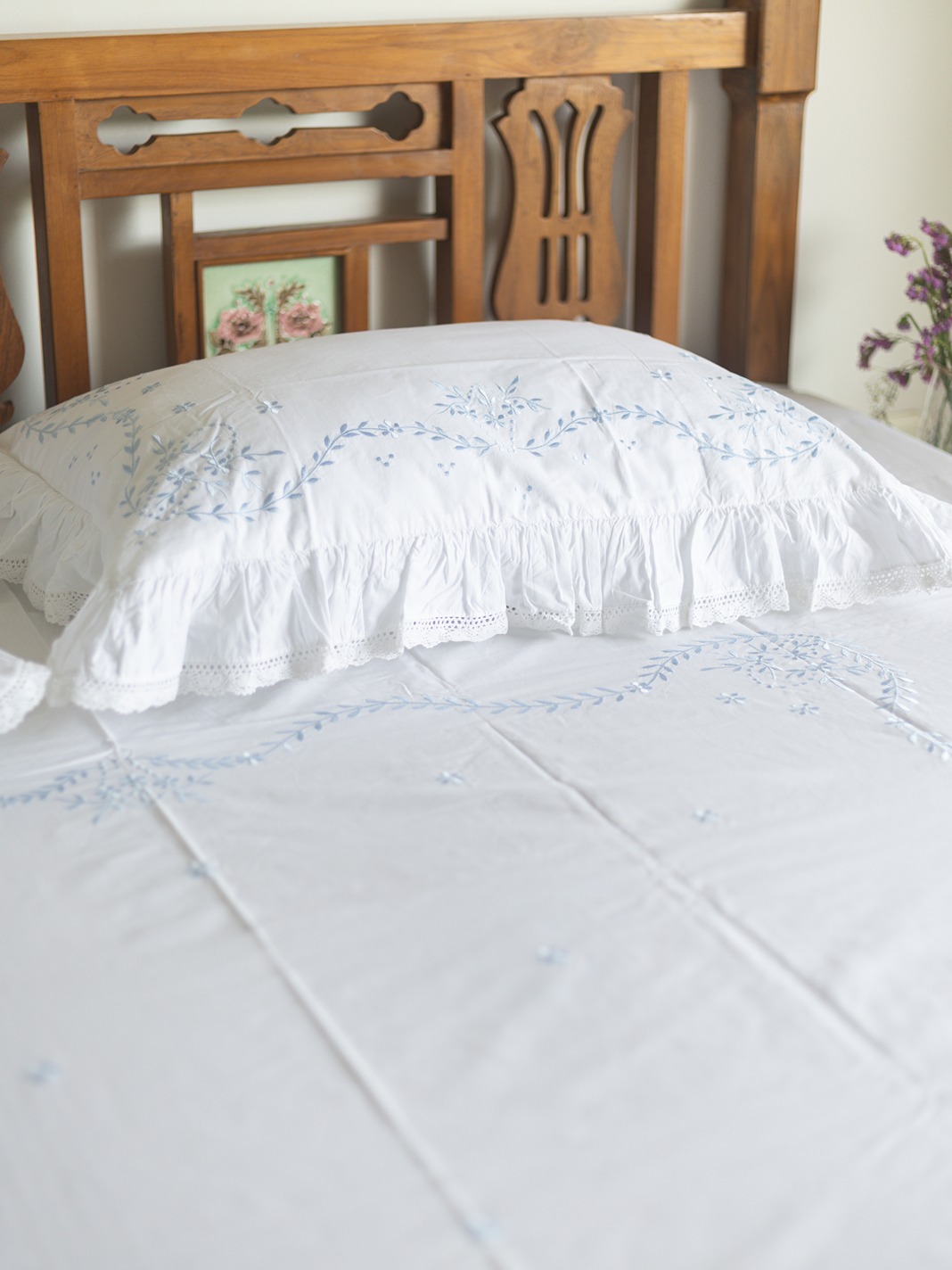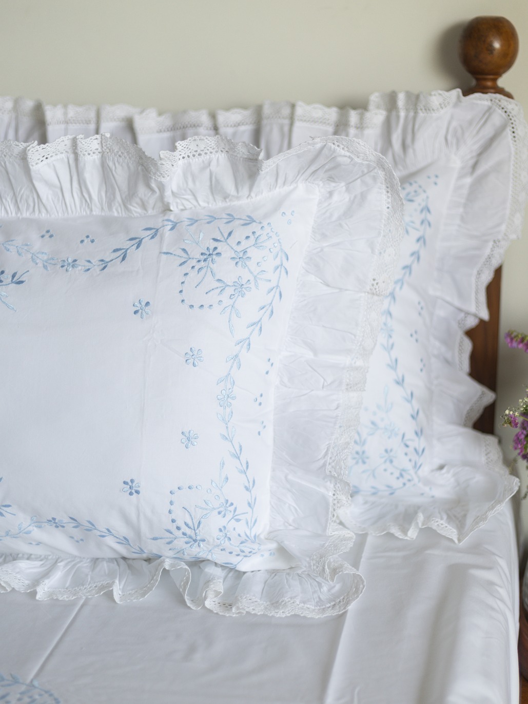The set includes 1 embroidered bed cover with 2 embroidered pillow covers with ruffle detailing.