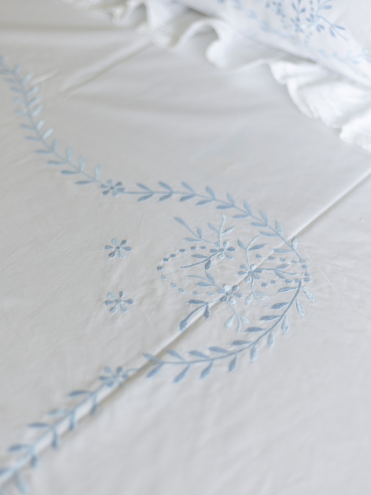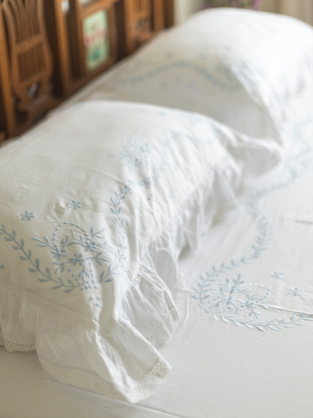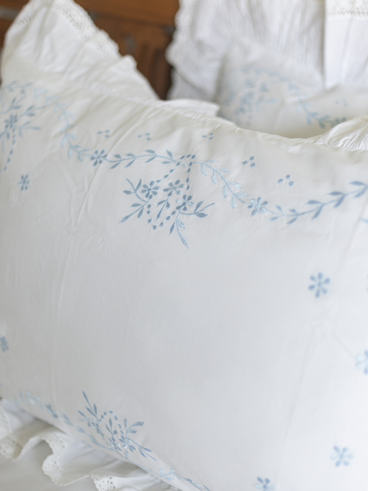 The set includes 1 embroidered bed cover with 2 embroidered pillow covers with ruffle detailing.