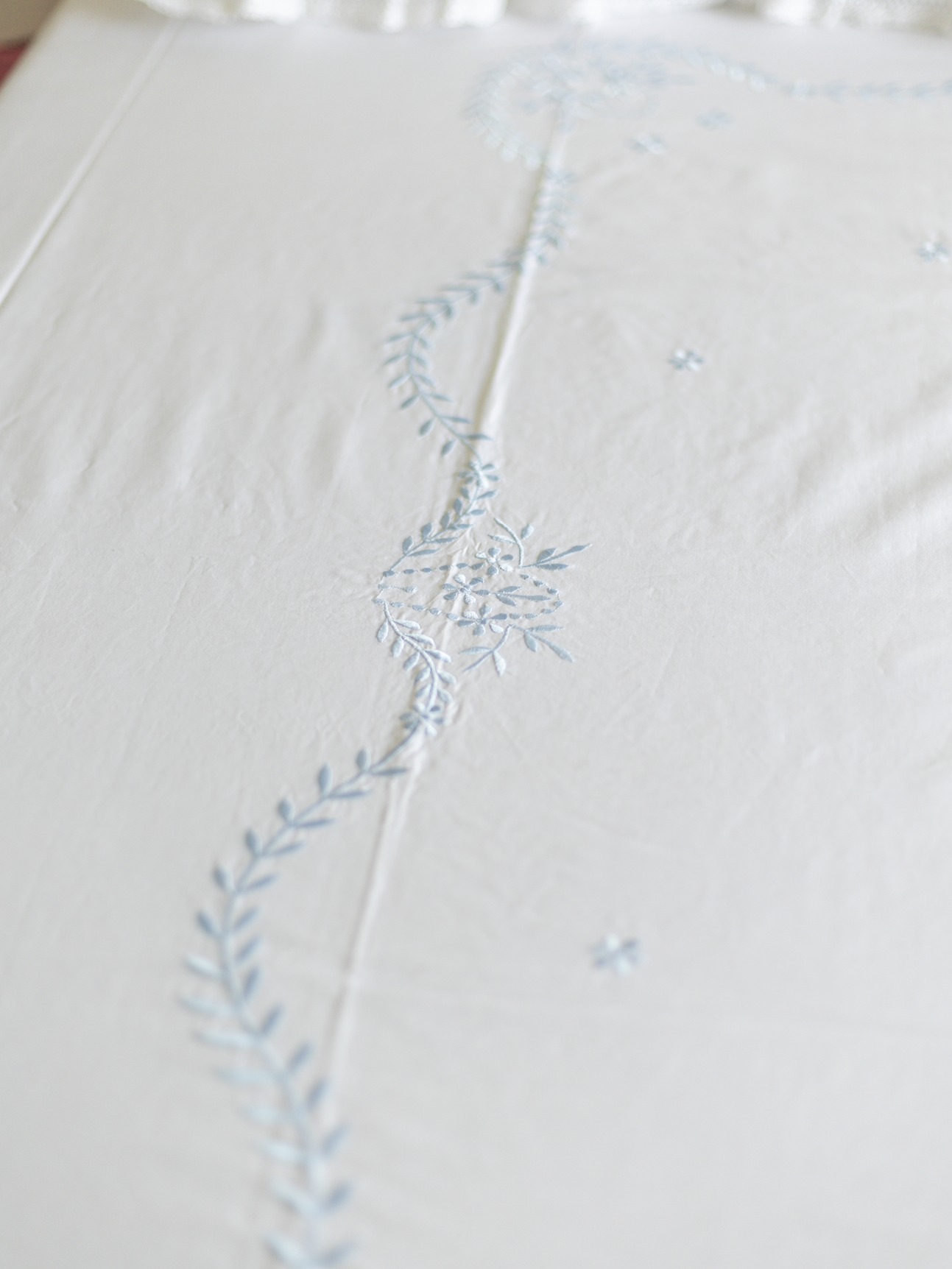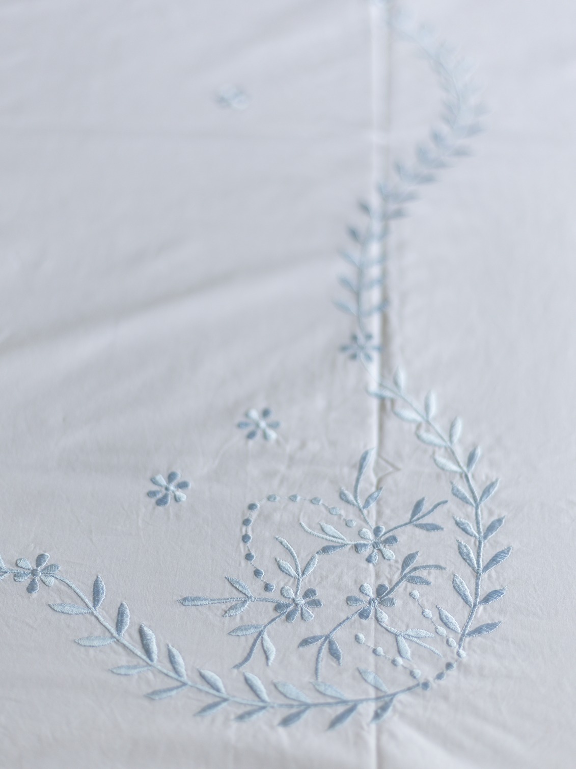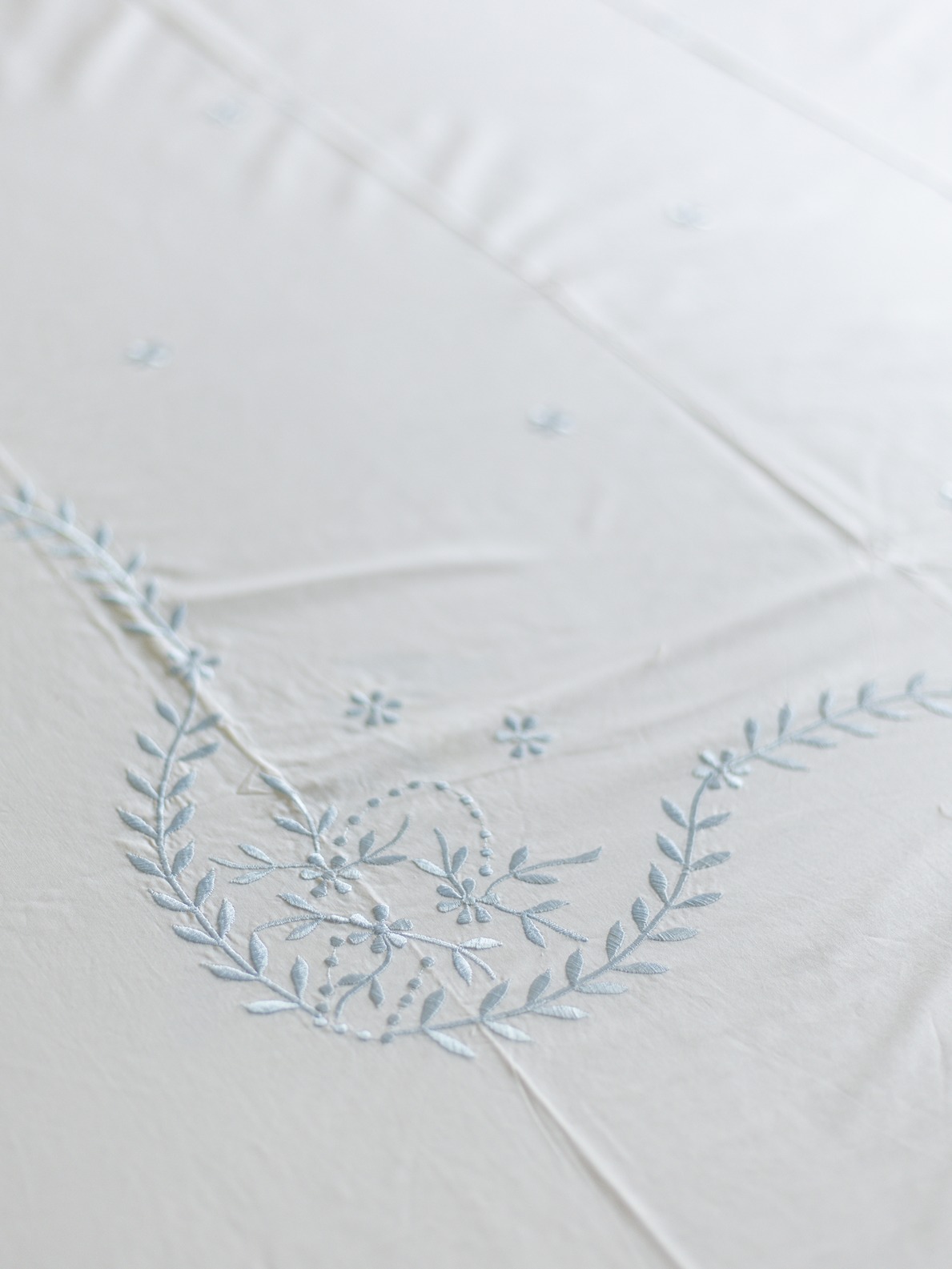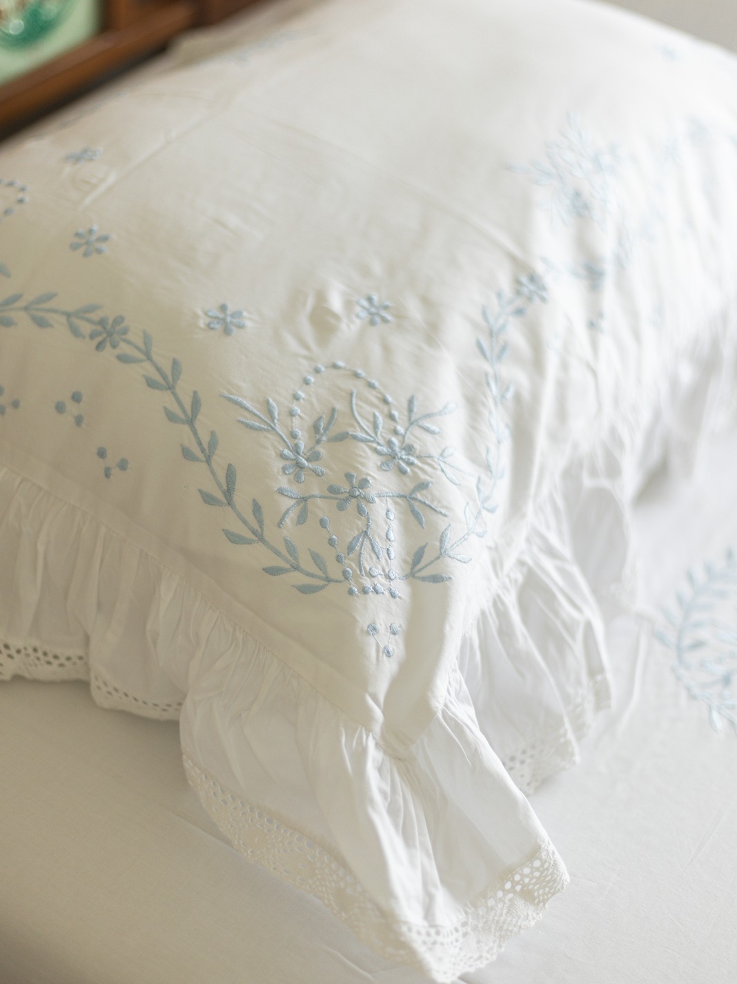 The set includes 1 embroidered bed cover with 2 embroidered pillow covers with ruffle detailing.