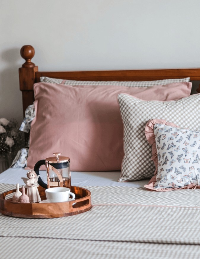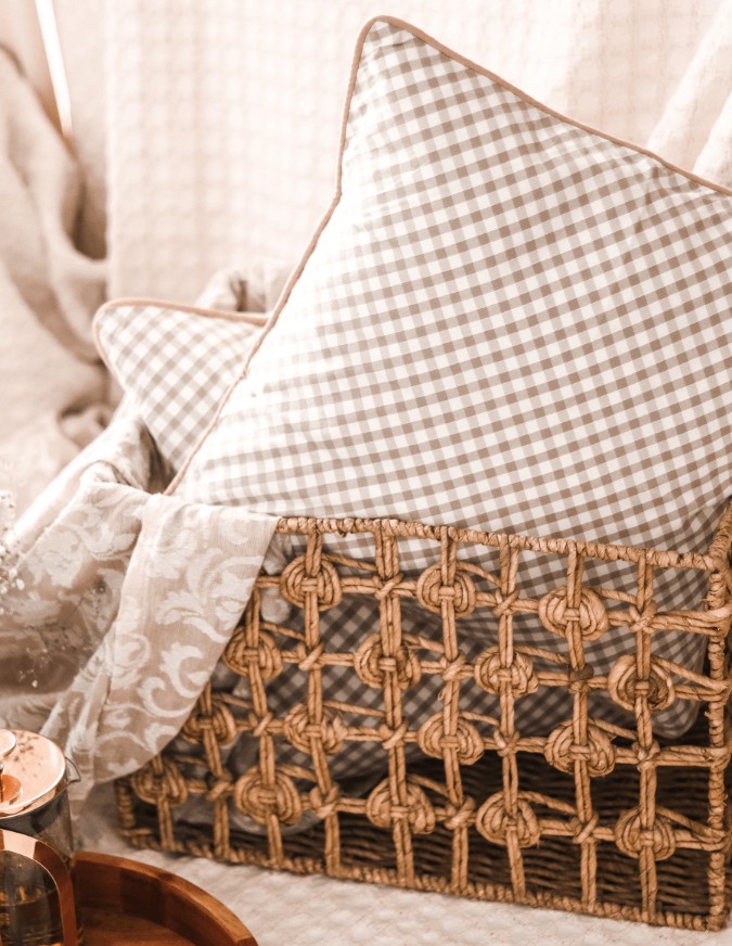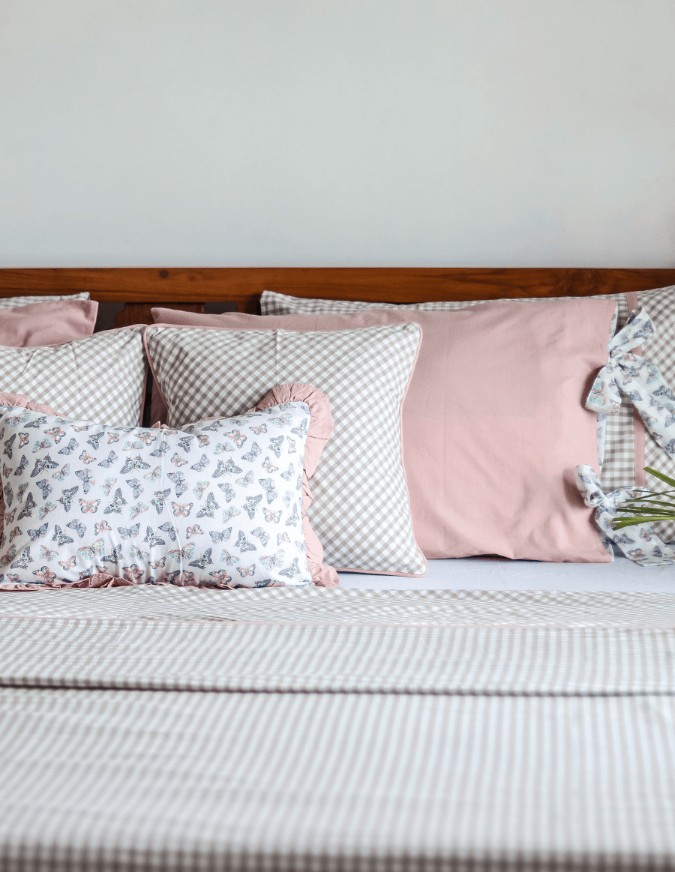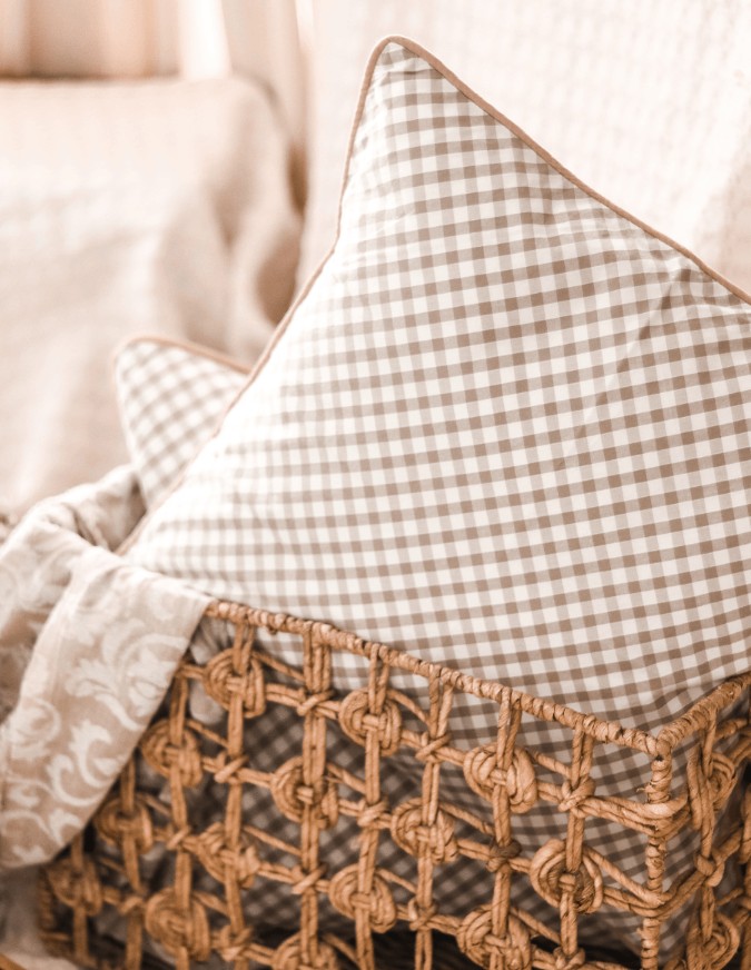 Cushion covers in classic neutral beige gingham themed with muted pink piping around.