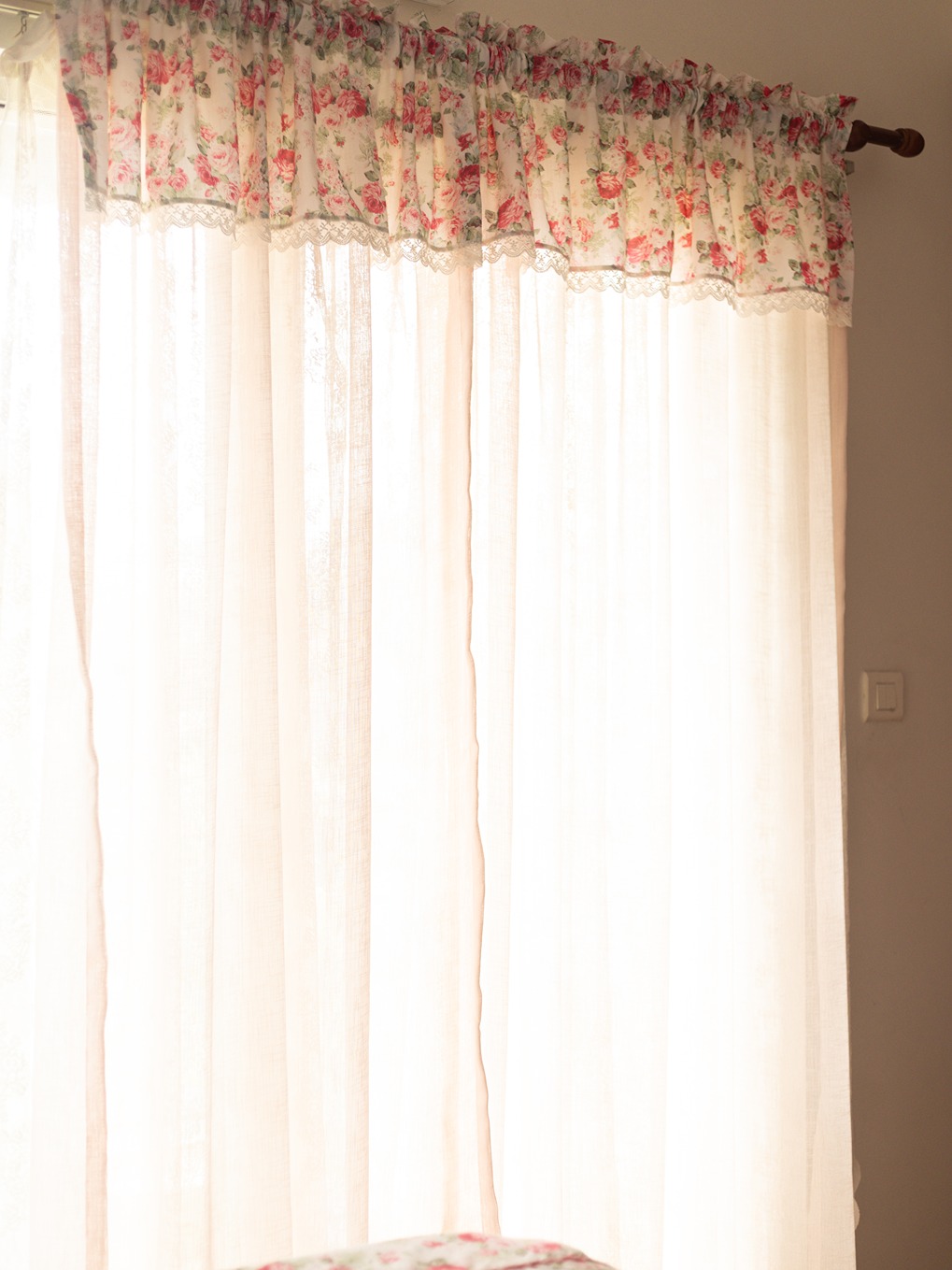 Pattern : Pink Sheer with floral ruffles attached to the top part of the white sheer curtain
