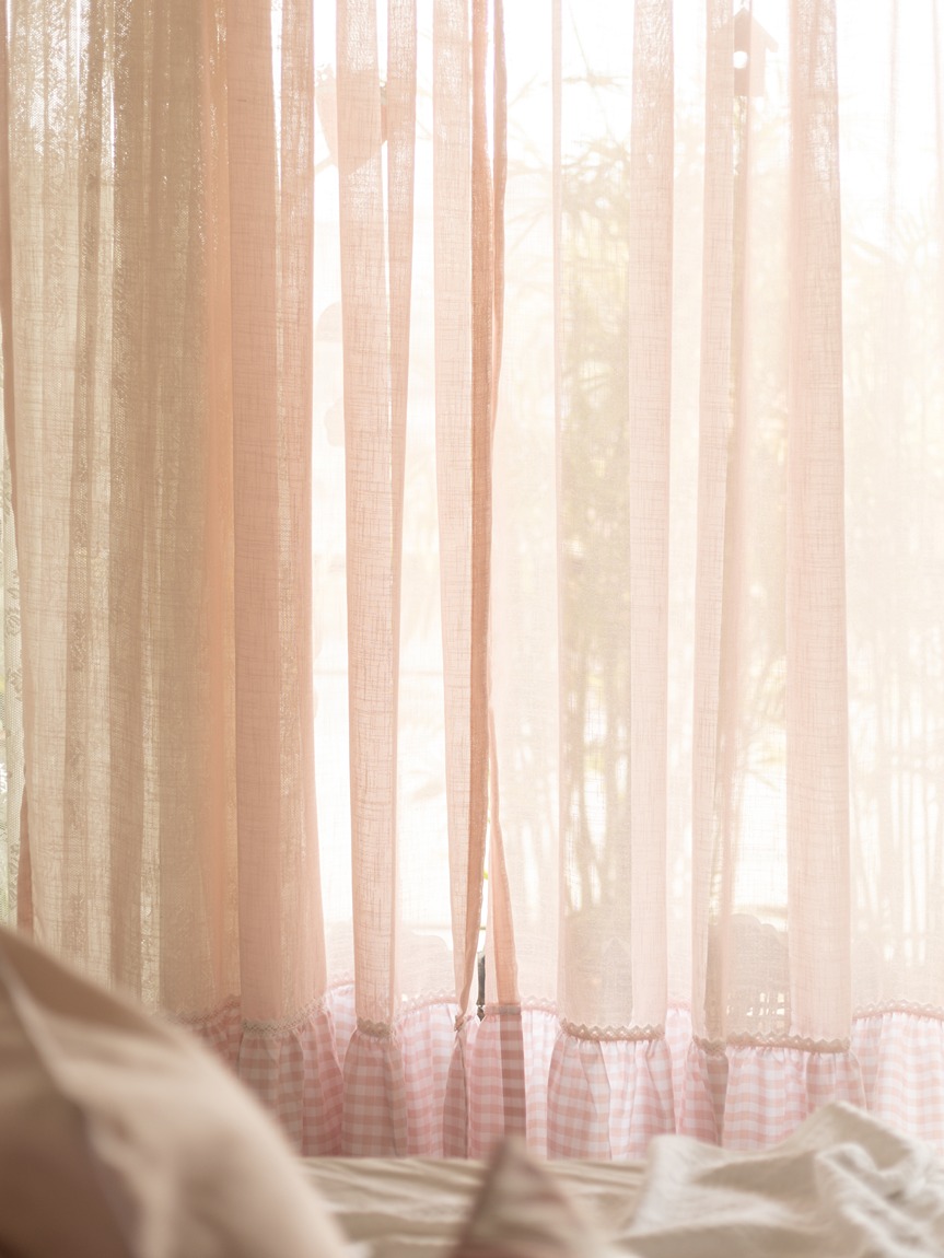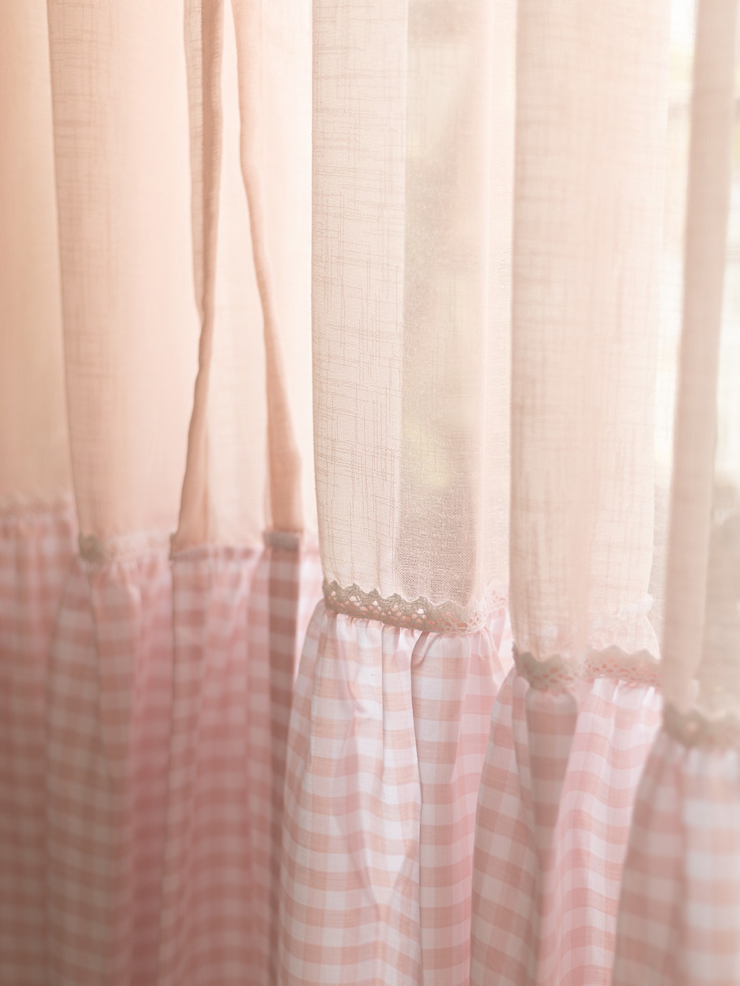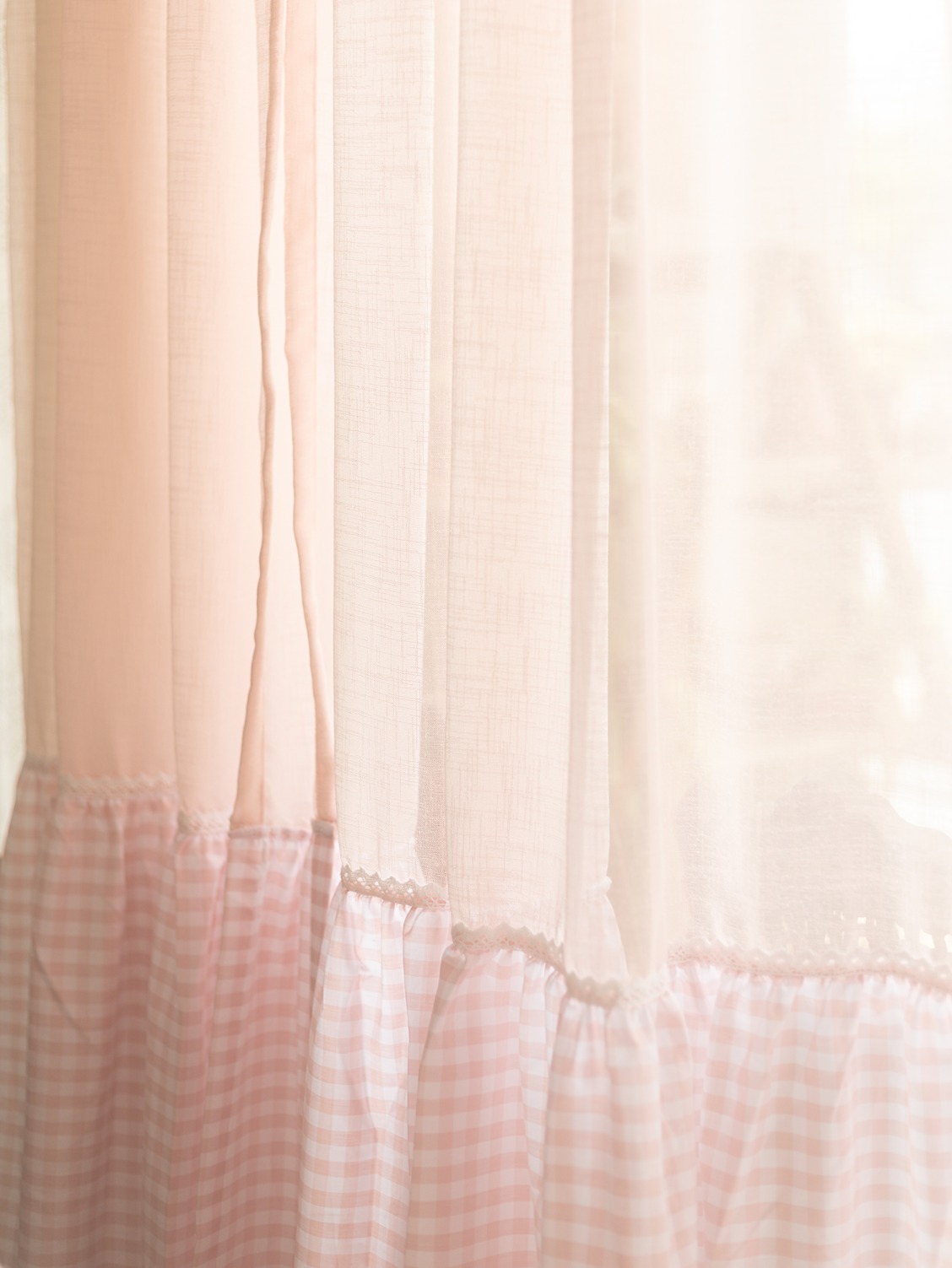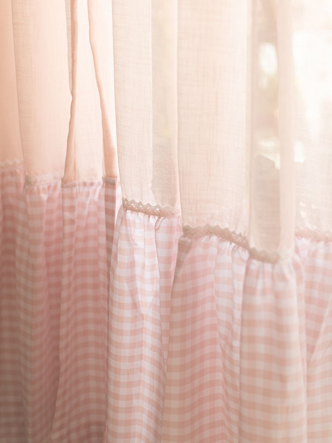 Pattern : Pink Sheer with gingham ruffles attached to the bottom part of the sheer curtain