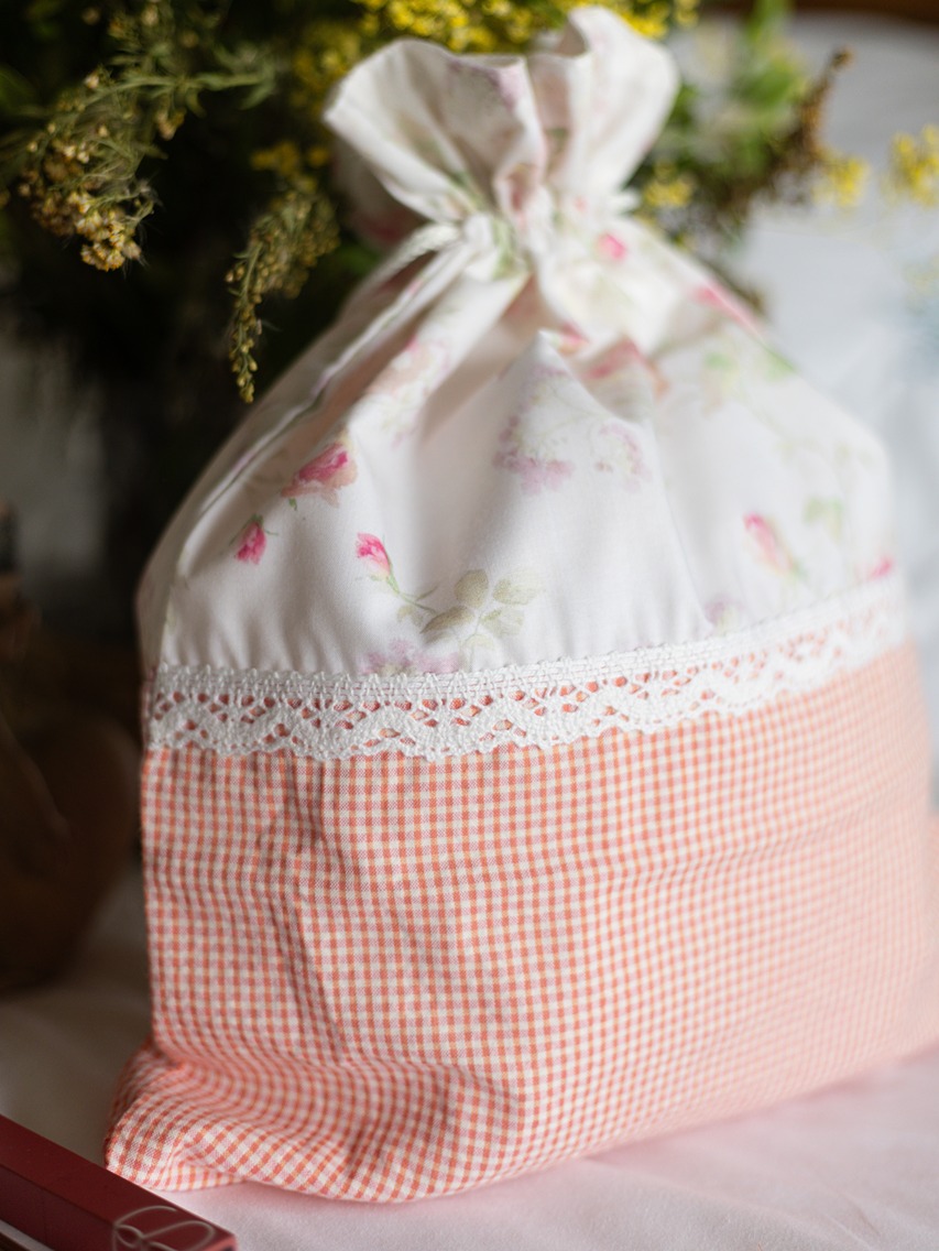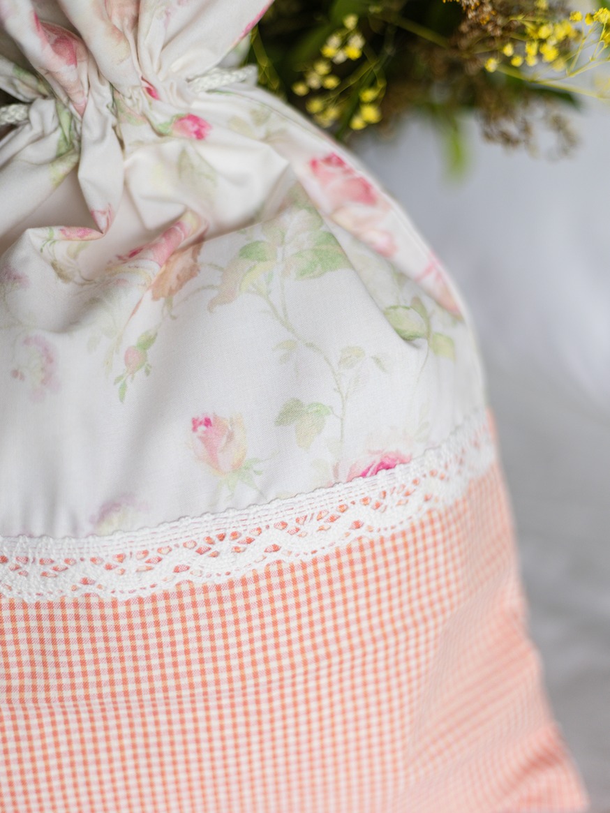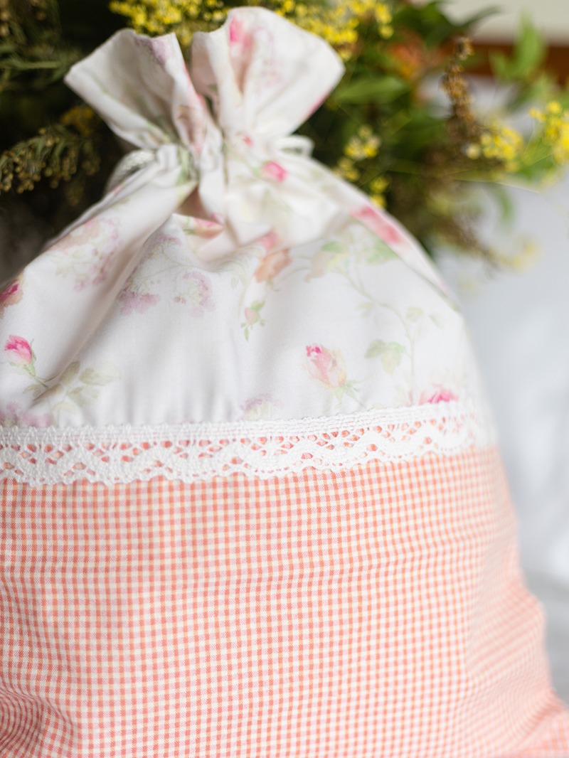 Drawstring organiser bags with floral and gingham detailing.