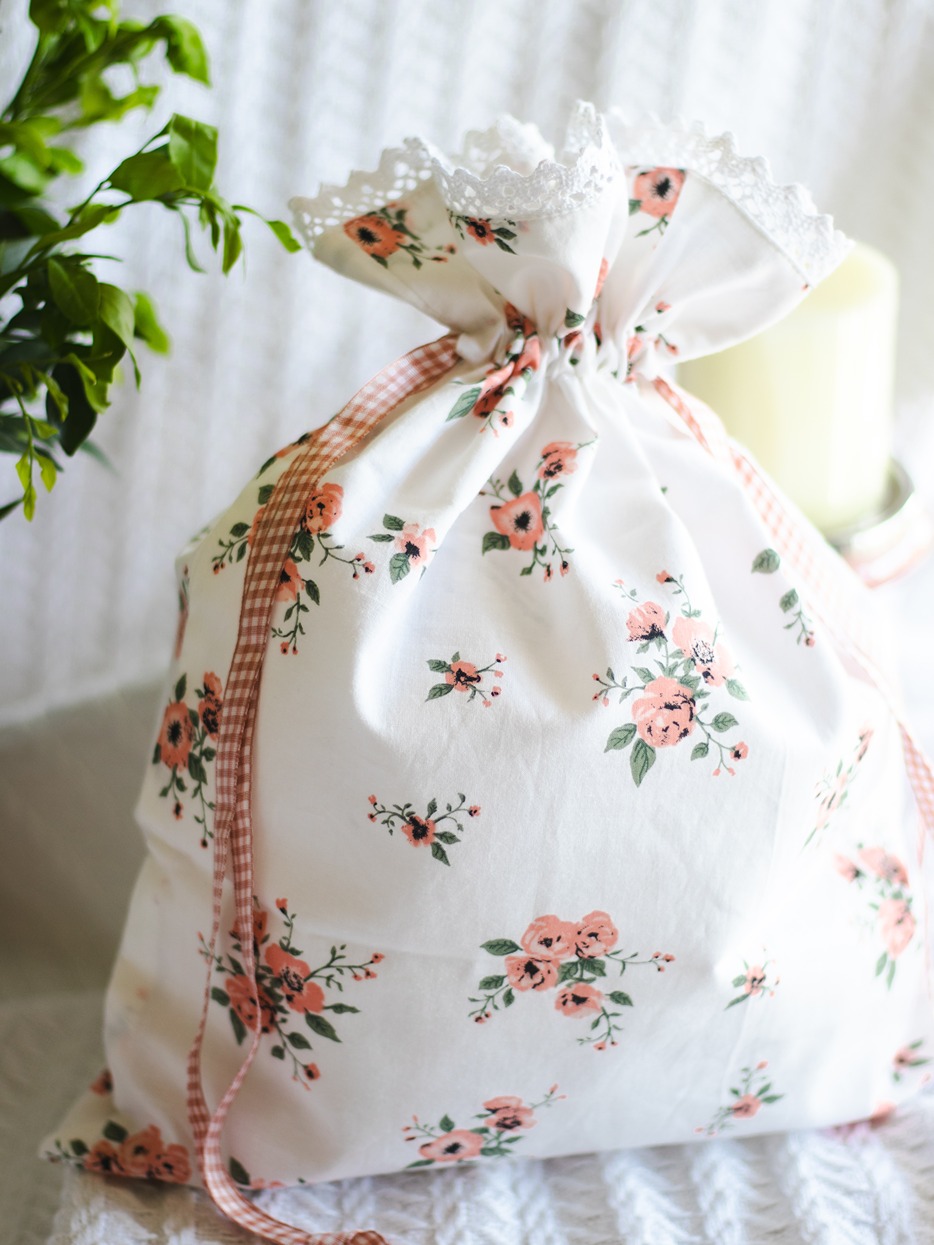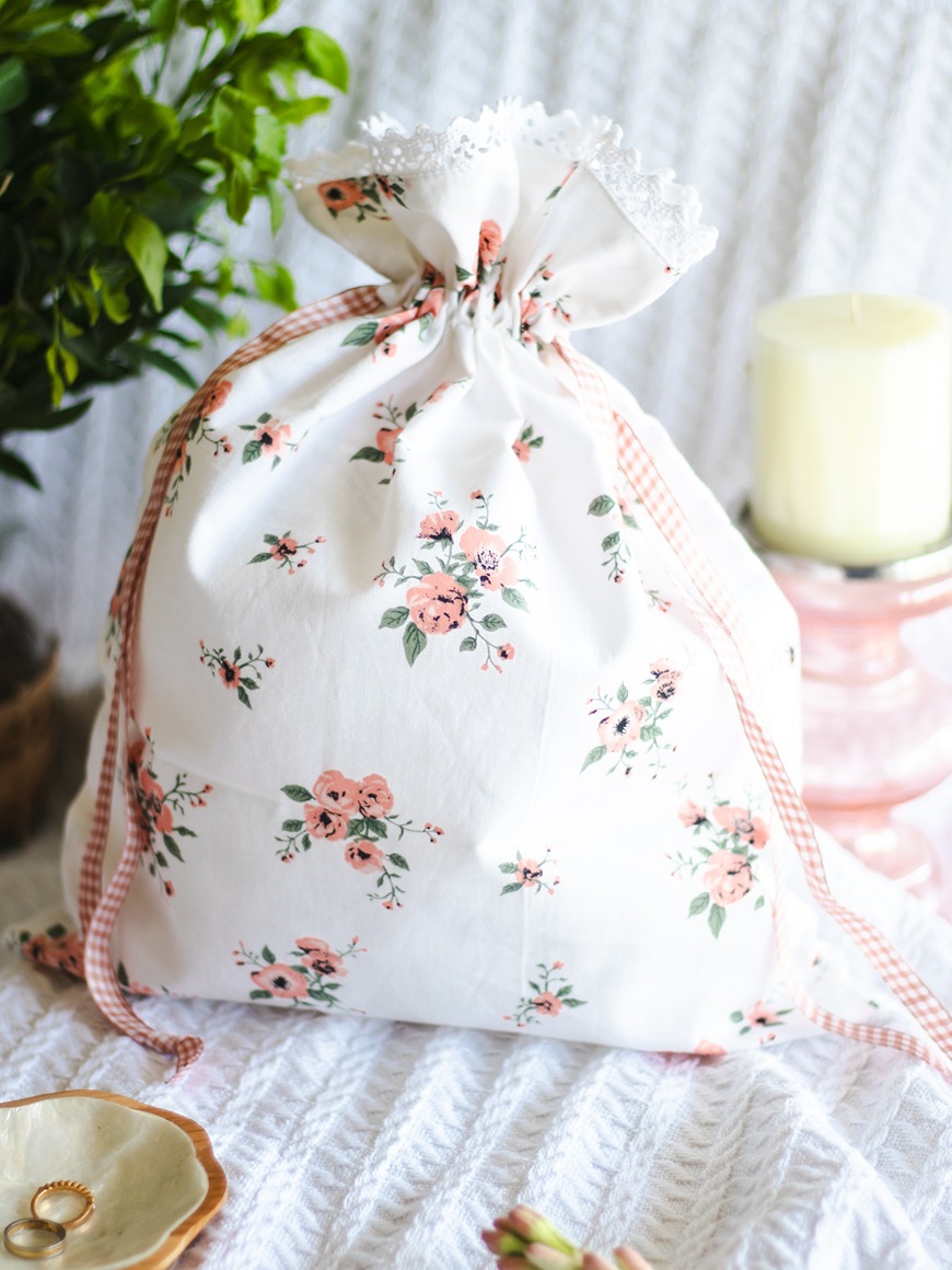 Drawstring organiser bags with floral and lace detailing.