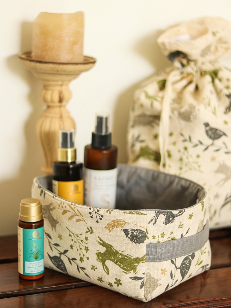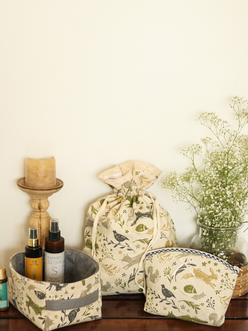 Drawstring organiser bags in floral and gingham theme.