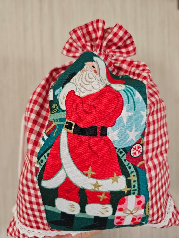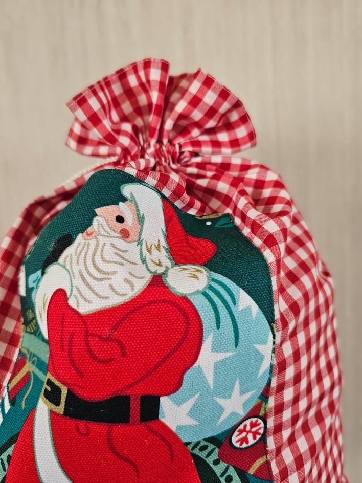 Drawstring goodie organiser bags in Christmas Santa theme. They serve well as gift pouches and as goodie bags.