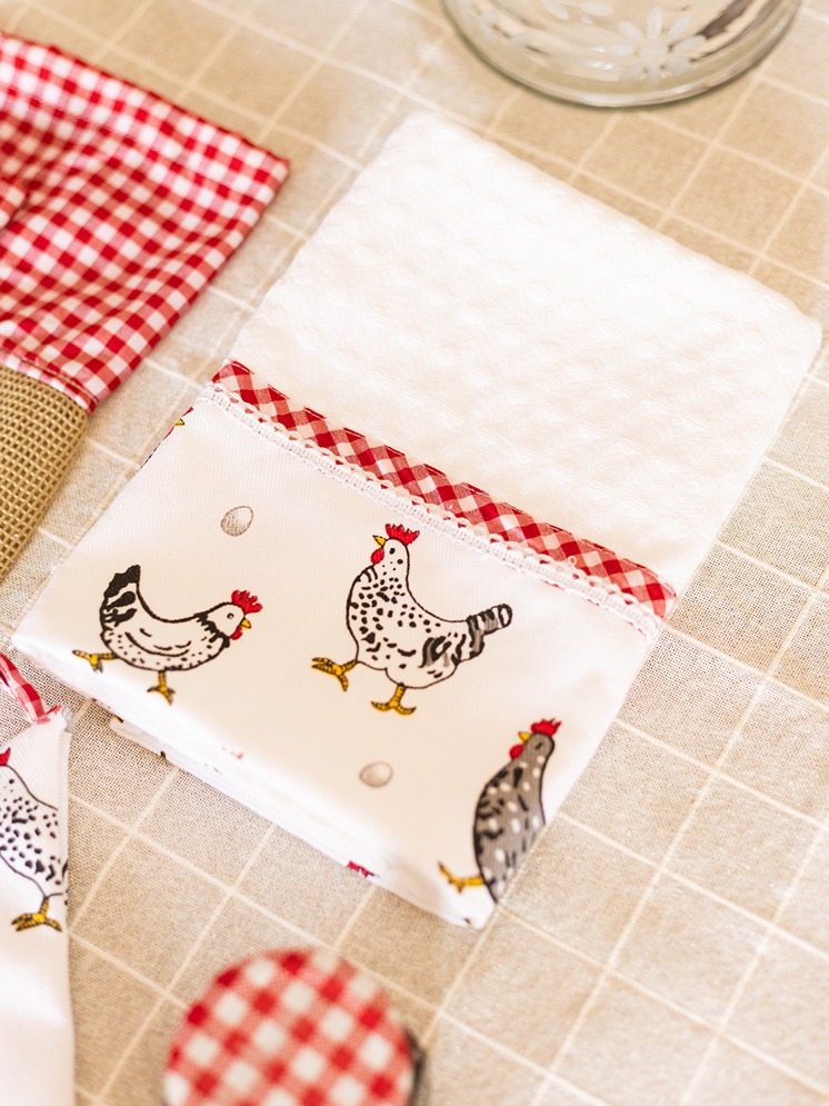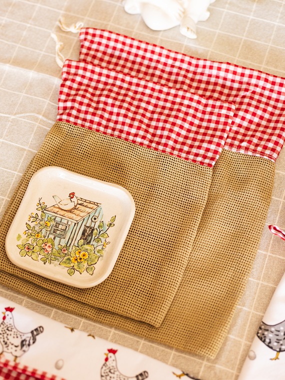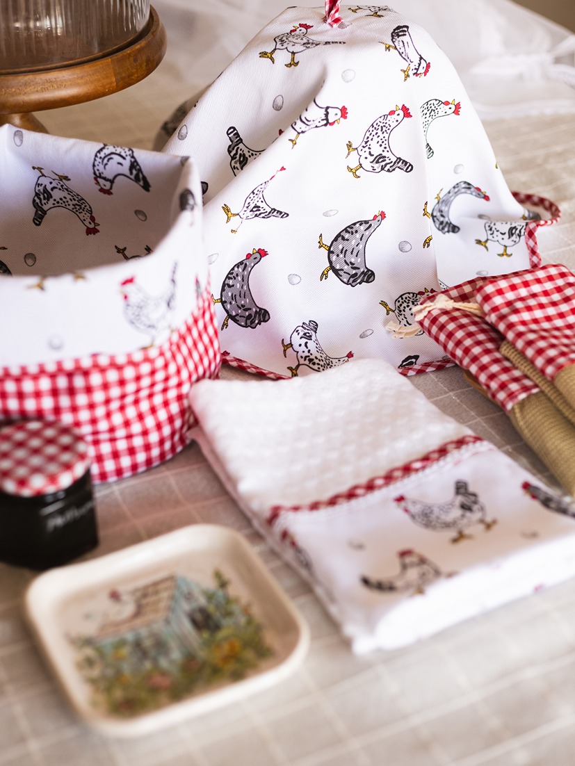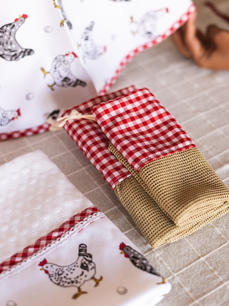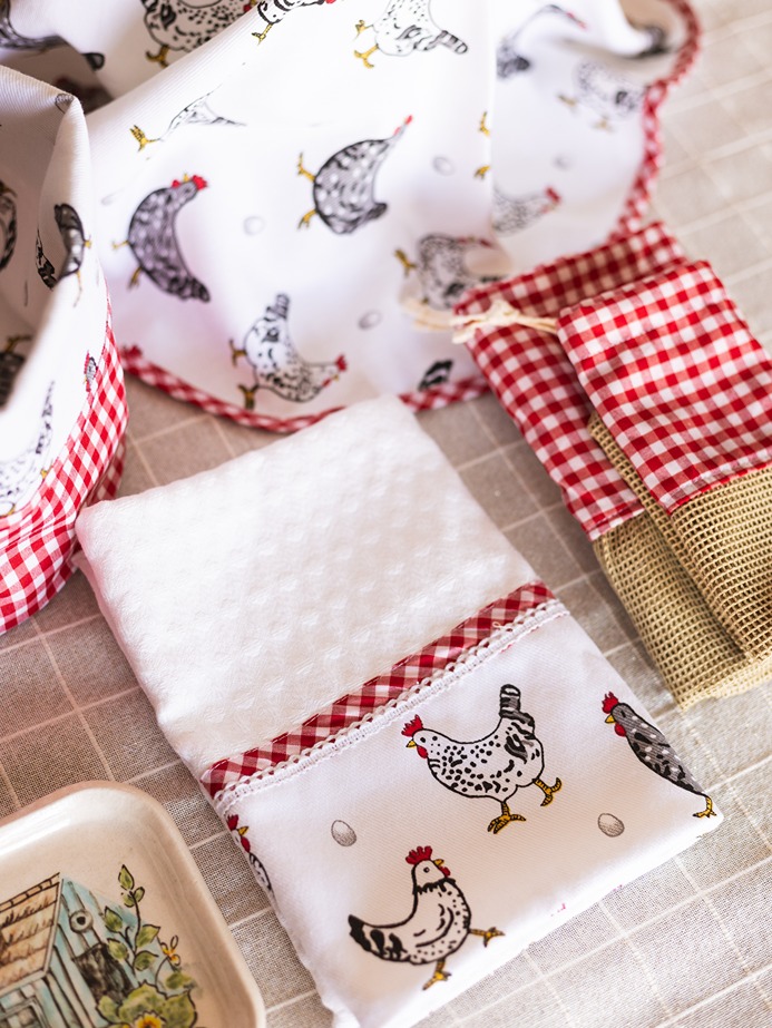Farmhouse style gift bundle for kitchen - Set of 5 - Fabric Basket, Appliance Cover, Napkin and Vegie Bags
