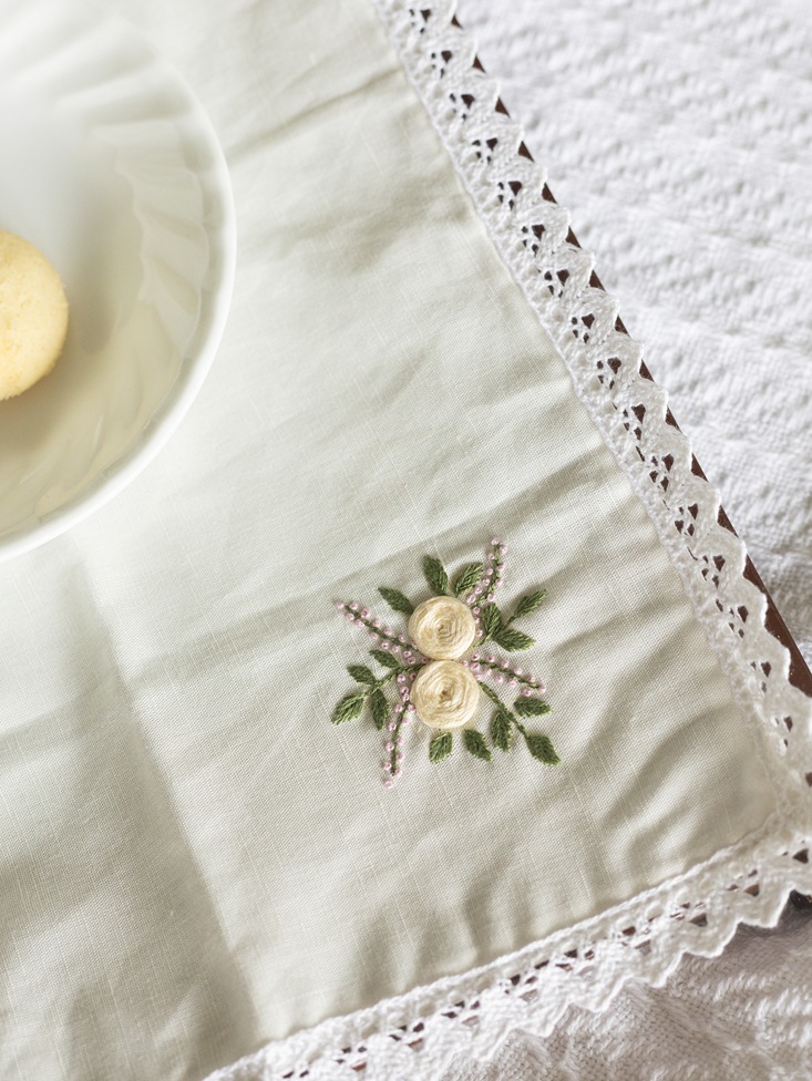 Style: Hand embrodiered on ONE corner of the tray cloth