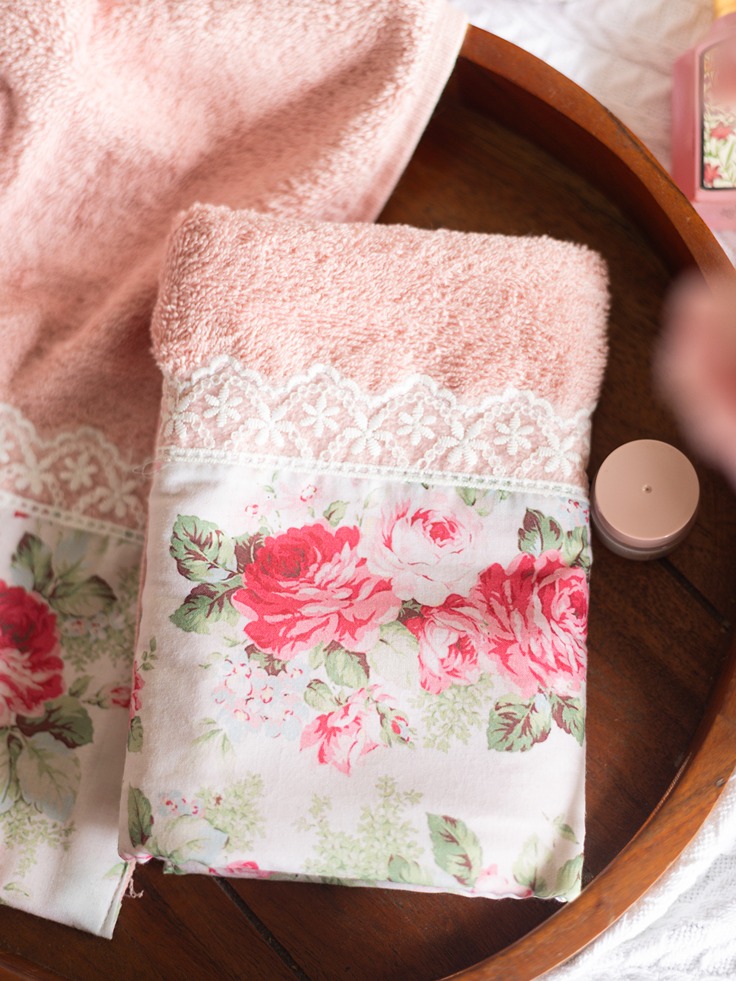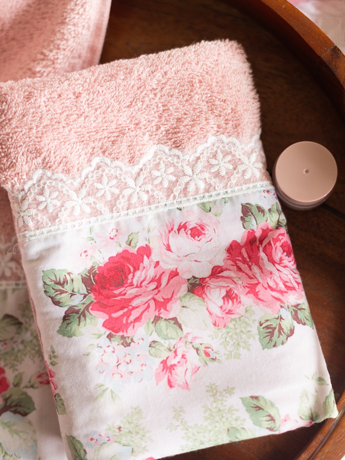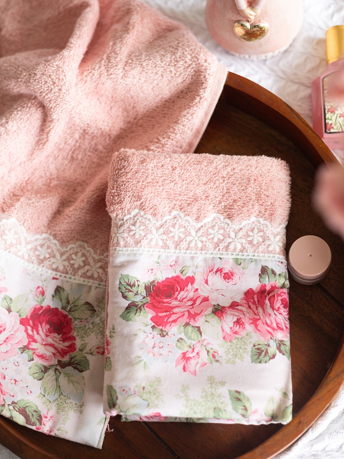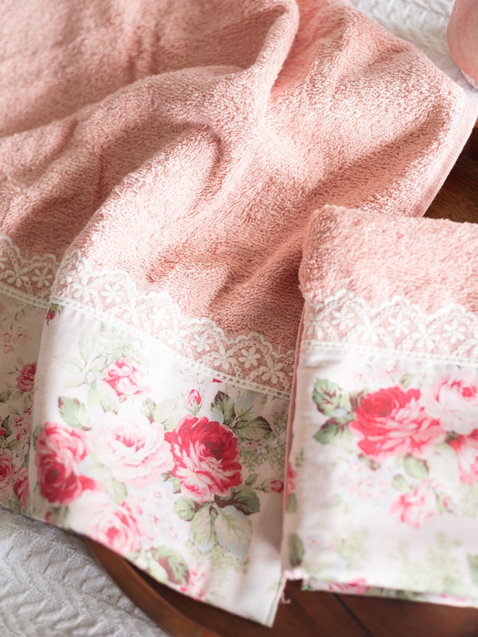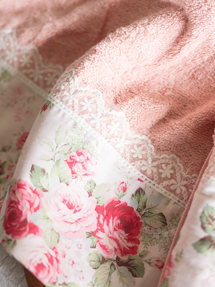 • Soft cotton hand towel with floral and lace detailing on one end of the towel.