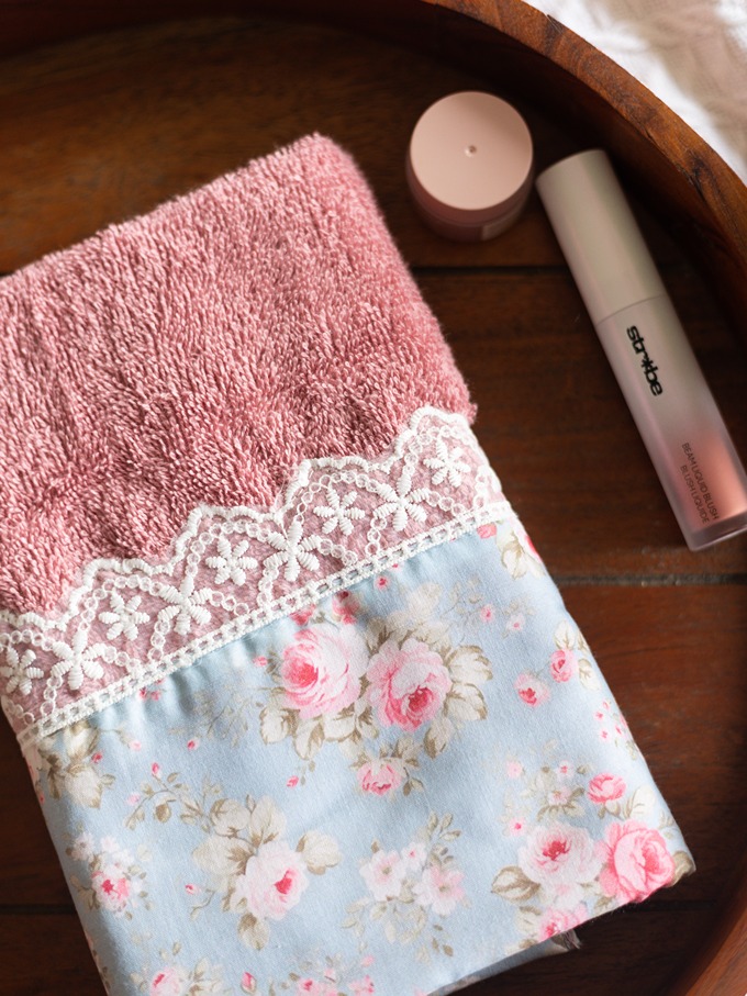 • Soft cotton hand towel with floral and lace detailing on one end of the towel.