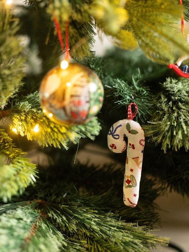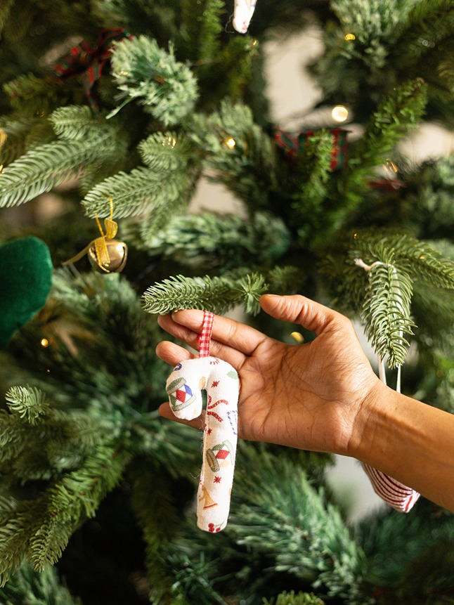 Stuffed ornament in candy stick shape with loop for hanging.