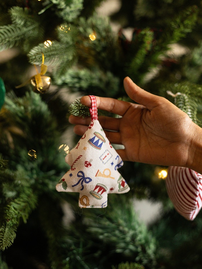 Stuffed ornament in Christmas tree shape with loop for hanging.