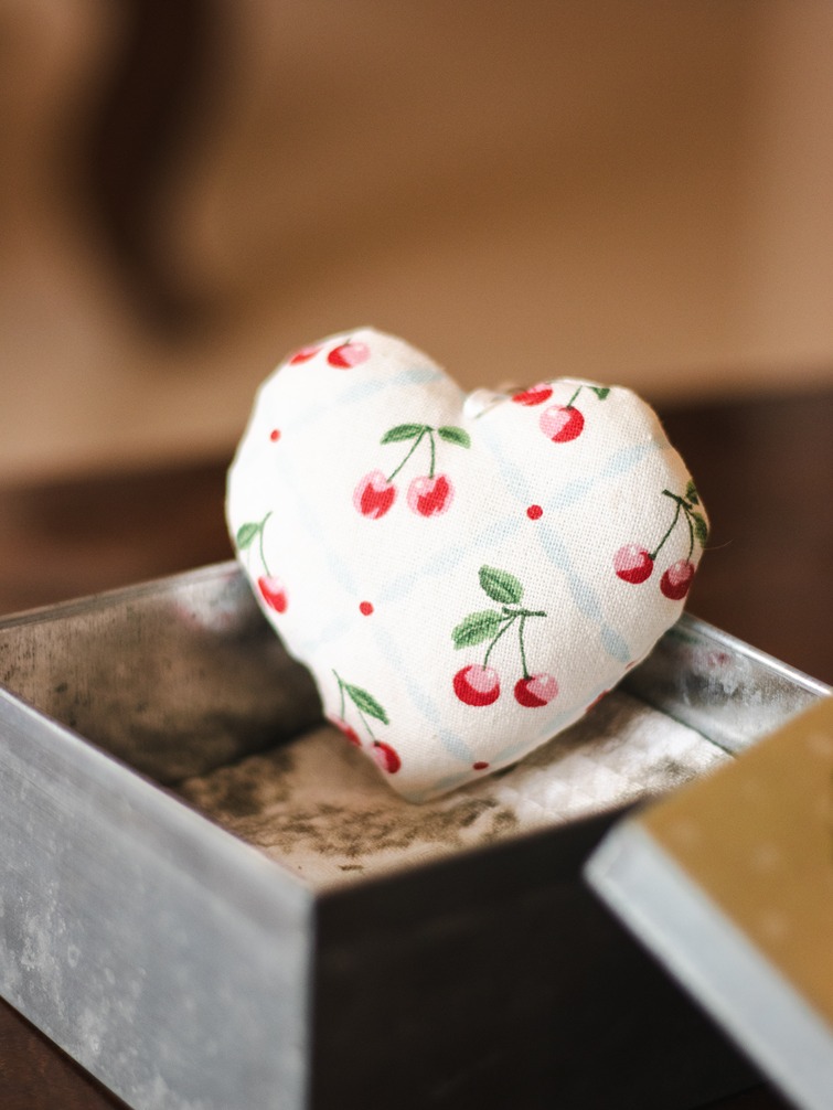 Stuffed fabric heart with loop for hanging.