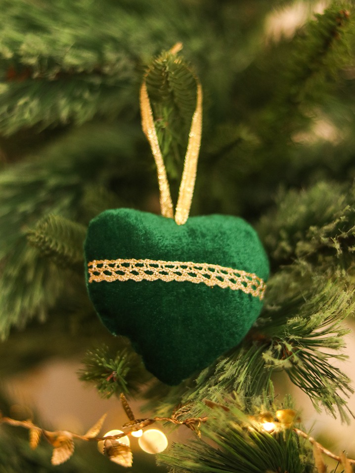 Stuffed fabric heart with loop for hanging. Gold lace on one side of the heart.