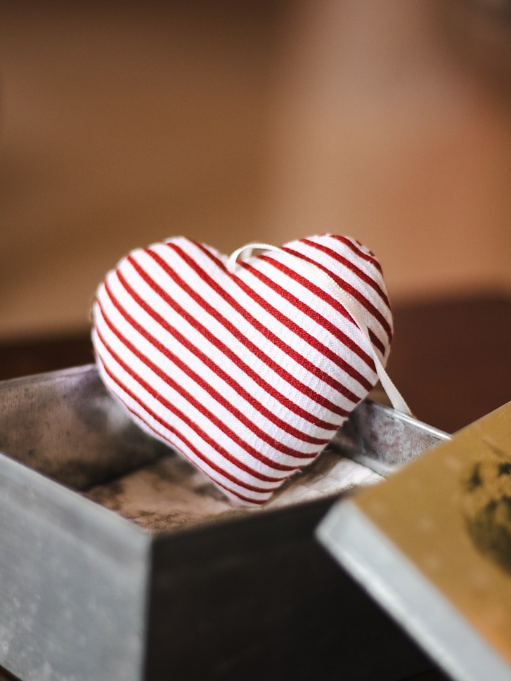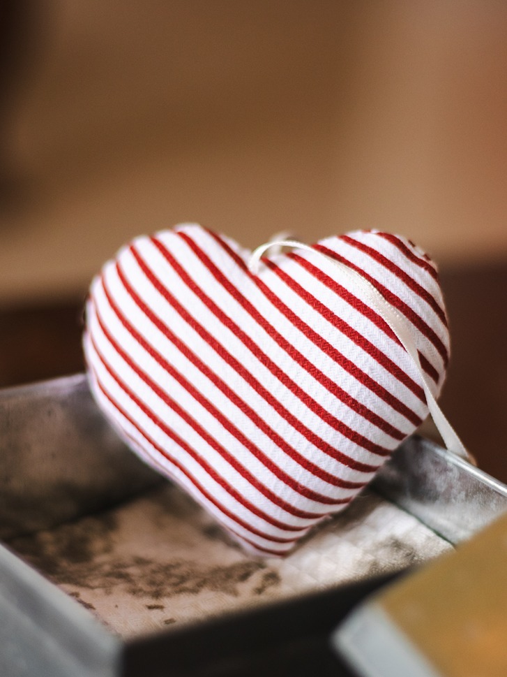 Stuffed fabric heart with loop for hanging.