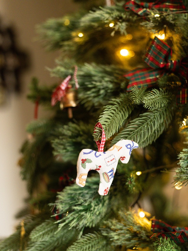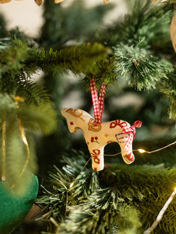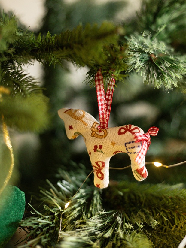 Stuffed ornament in Pony shape with loop for hanging.