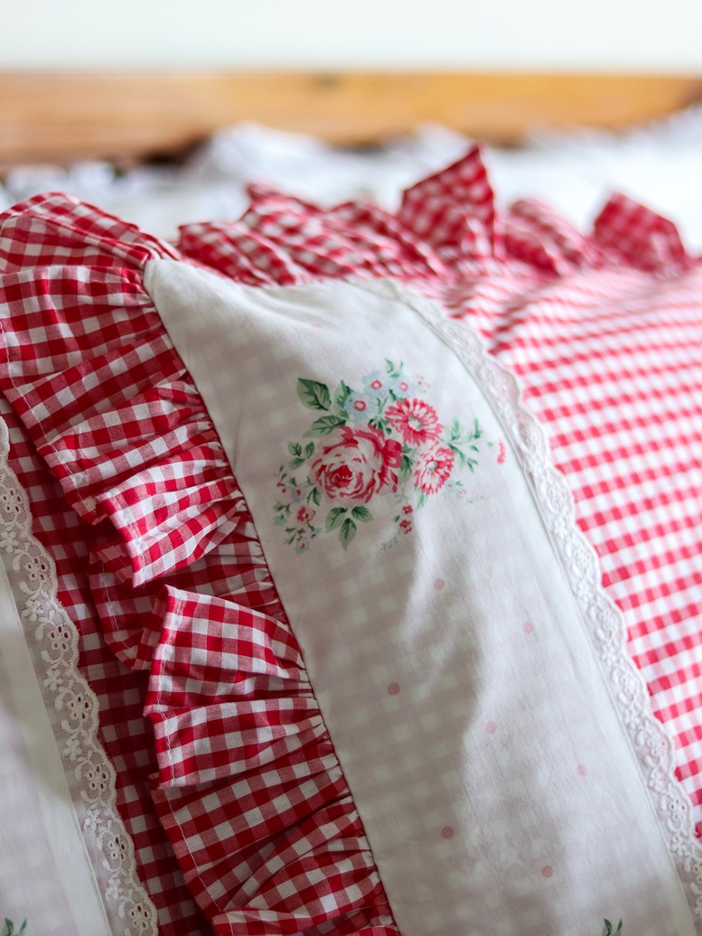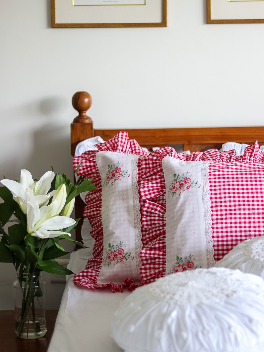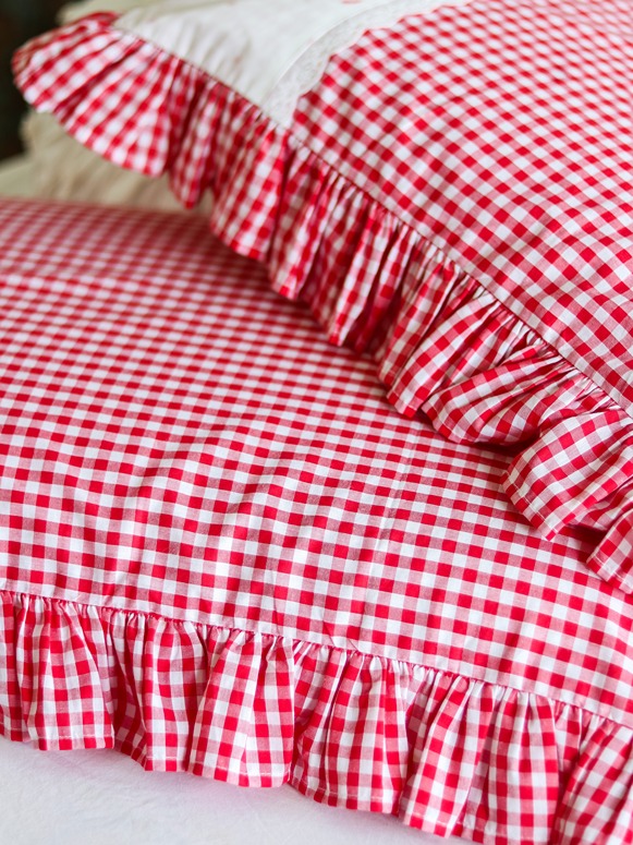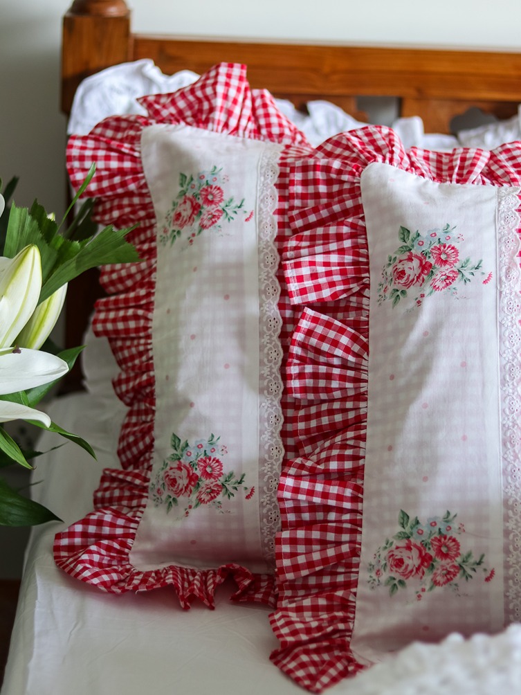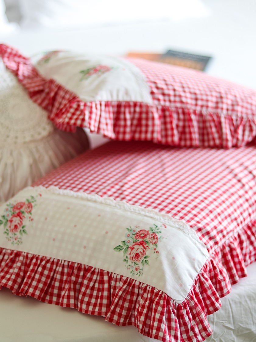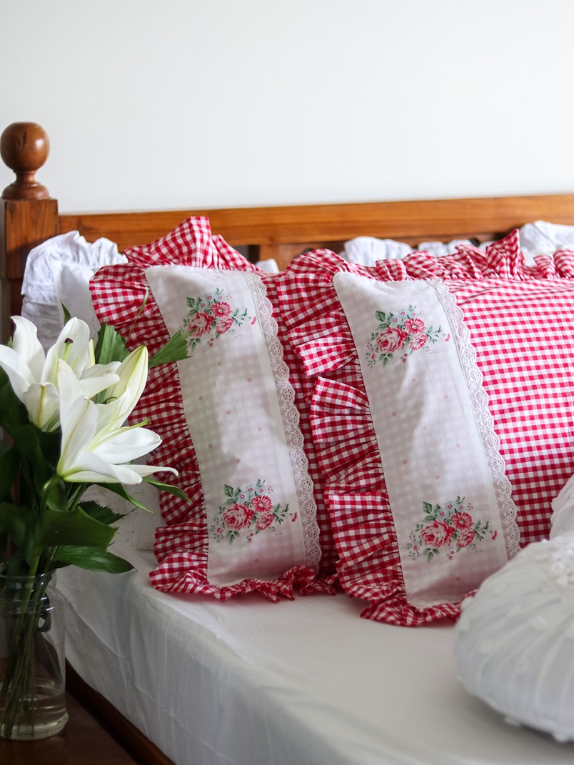 You can combine these with our classic white ruffled pillow covers, and use it along with any of your solid white or pastel bedsheets. The white round cushion covers and white lumbar cushion covers from our collection go very well with this gingham and floral pillow covers to complete that statement look.