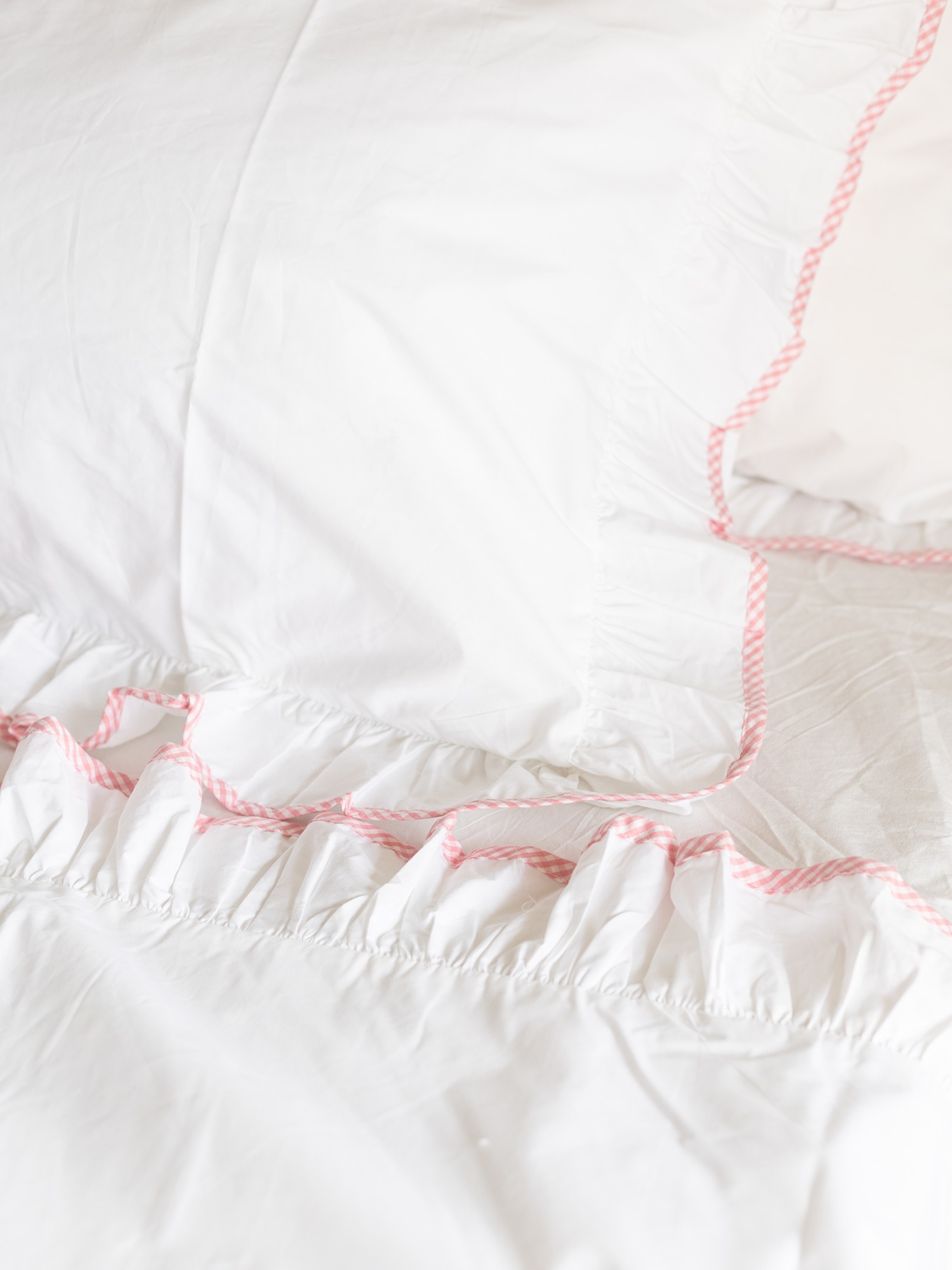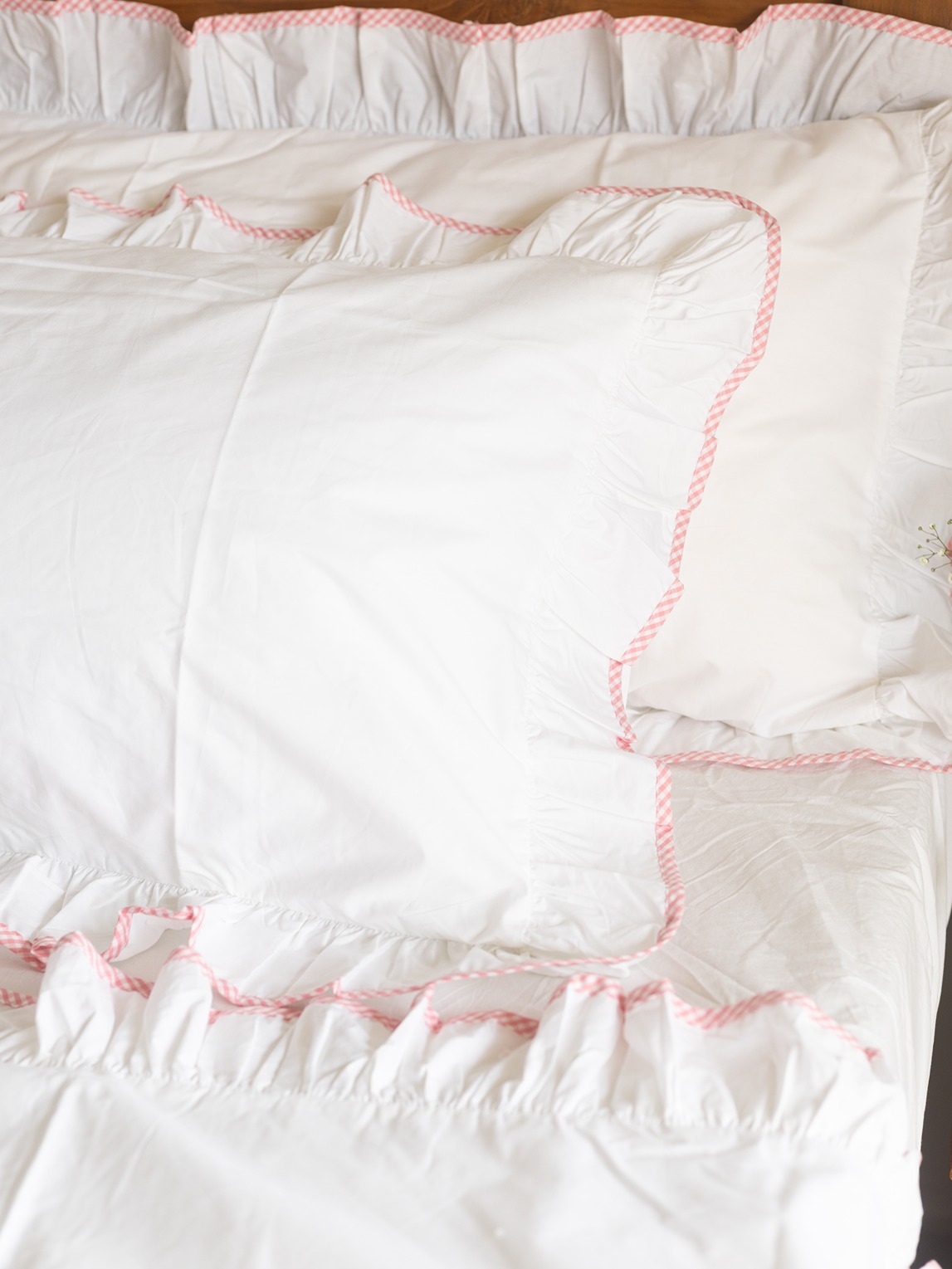Set of two pillow covers in white theme and ruffled edges are detailed with red gingham.