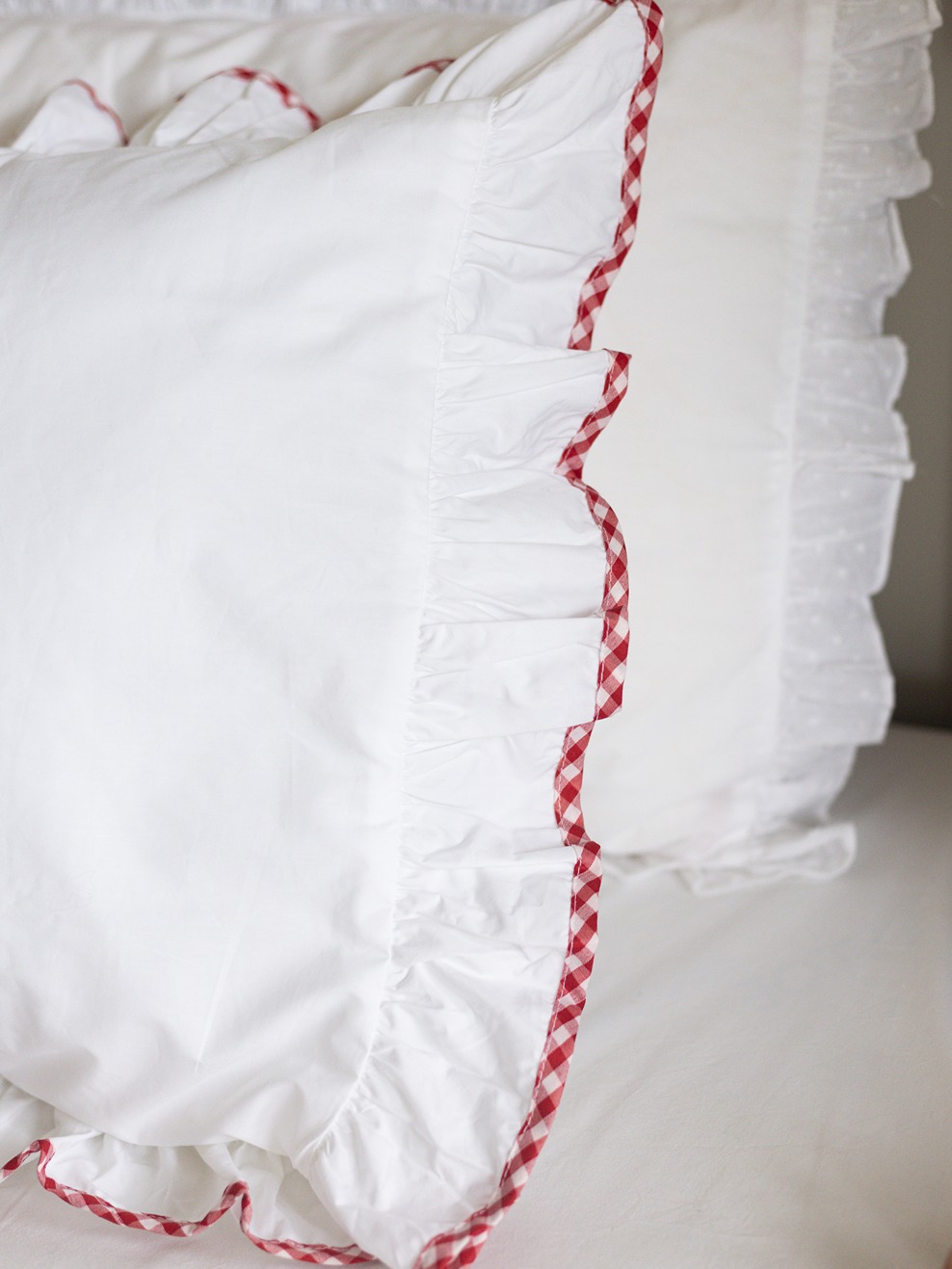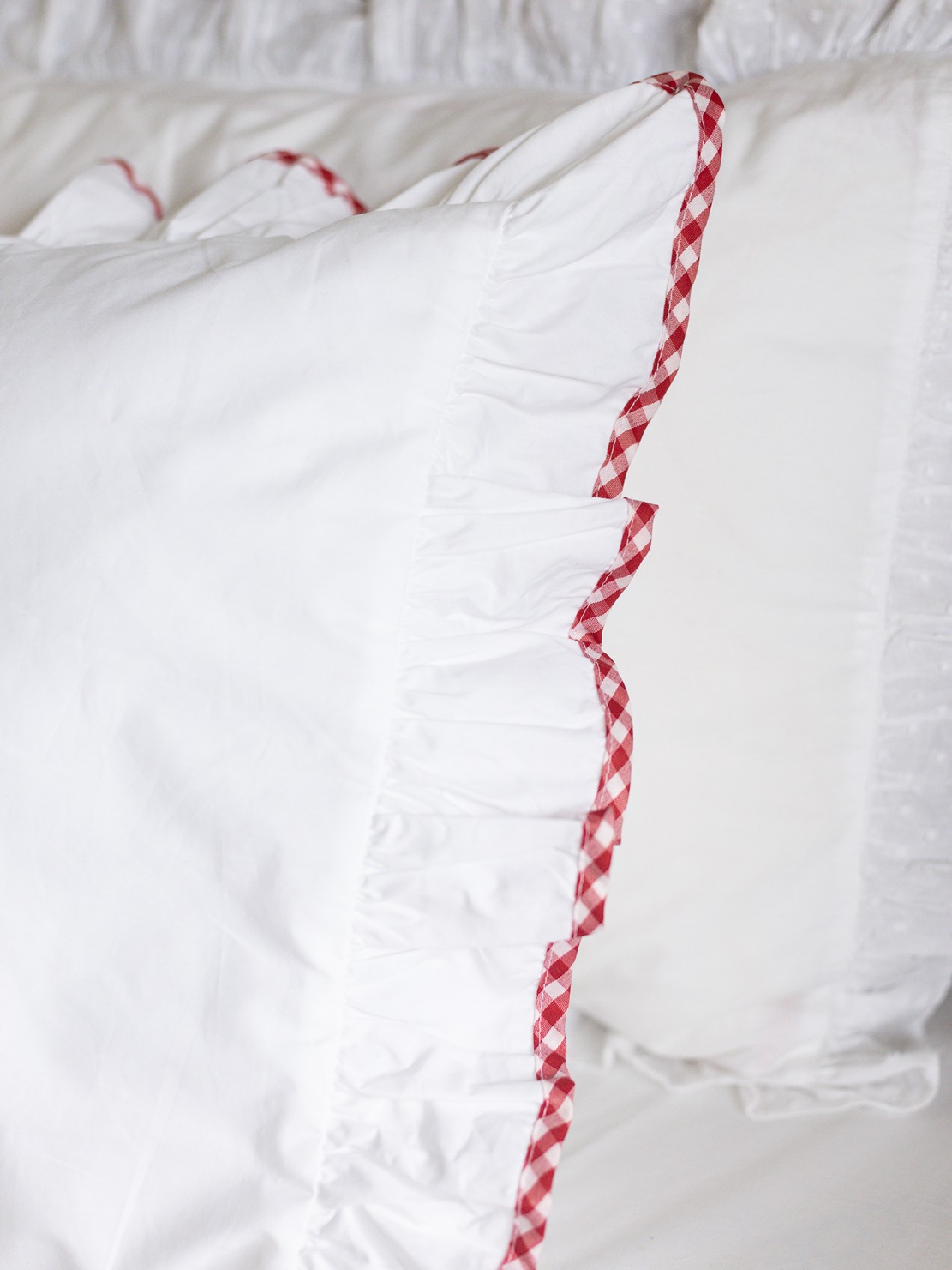 Set of two pillow covers in white theme and ruffled edges are detailed with red gingham.