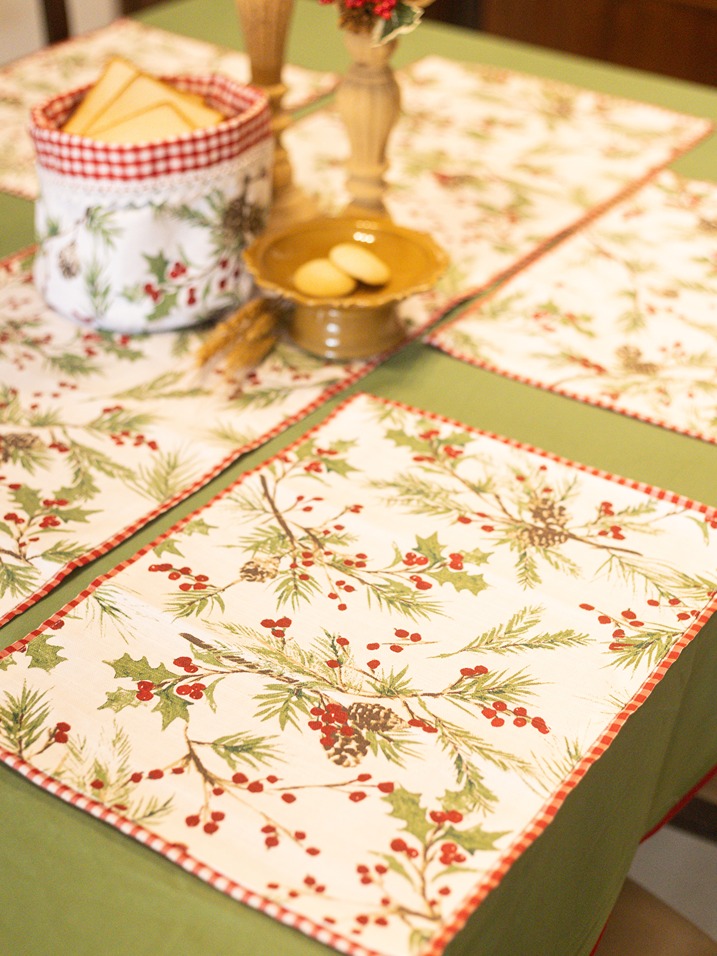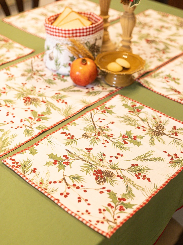 Christmas themed print on side 1, goes well with green, red as well as beige or golden themed table cover.