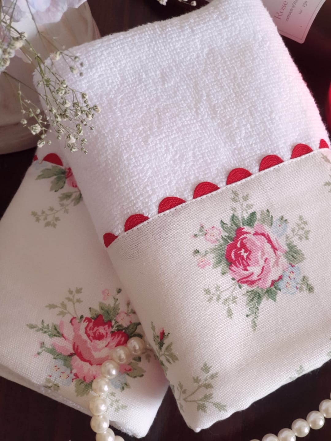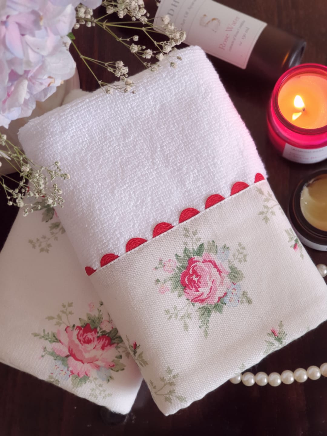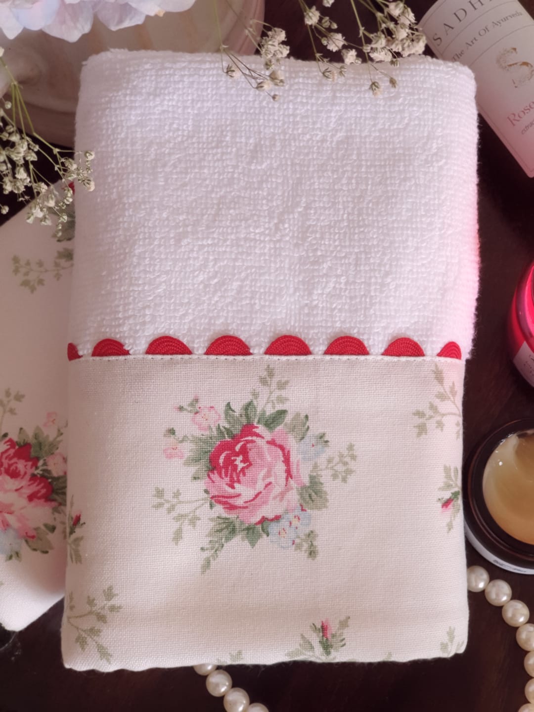Super soft white cotton hand towel with floral and lace detailing on one end of the towel.