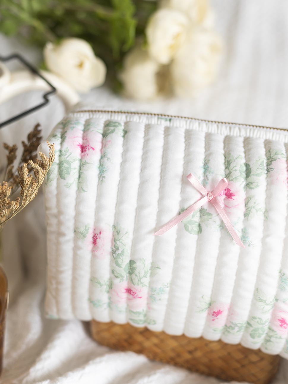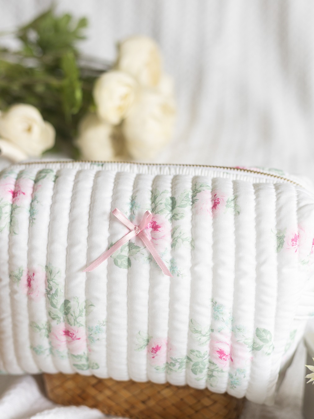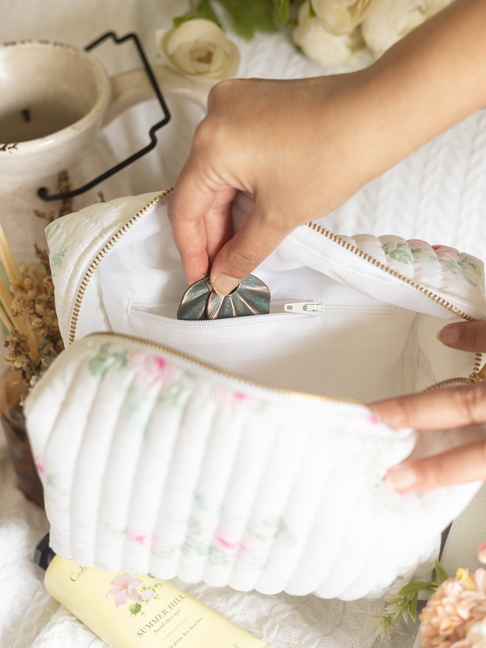- This pouch is lightly quilted and comes with smaller compartments inside for better organising small items.