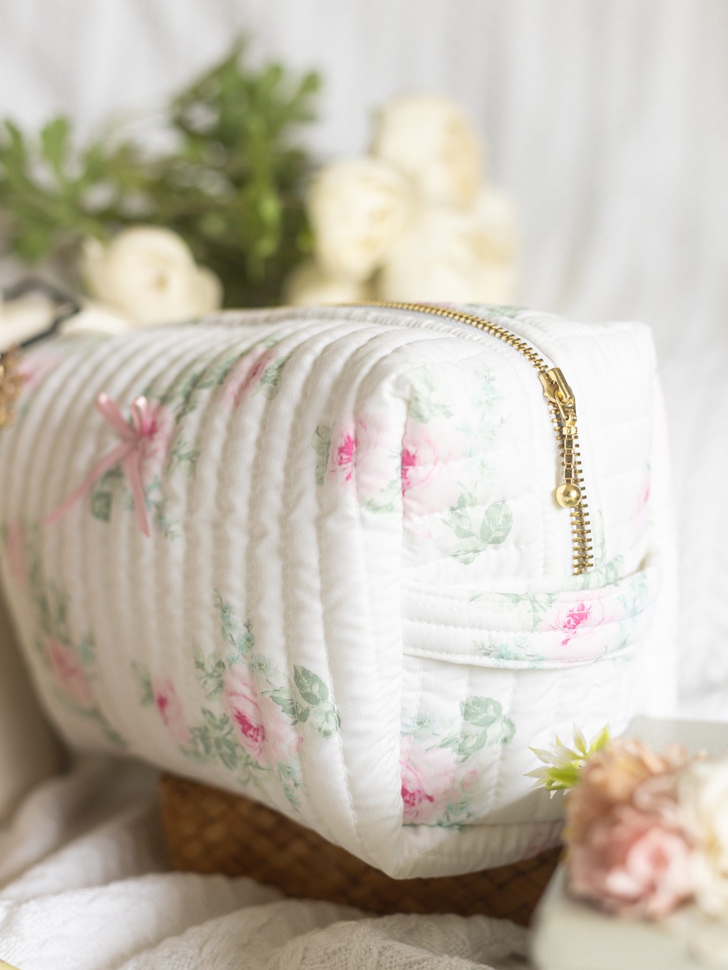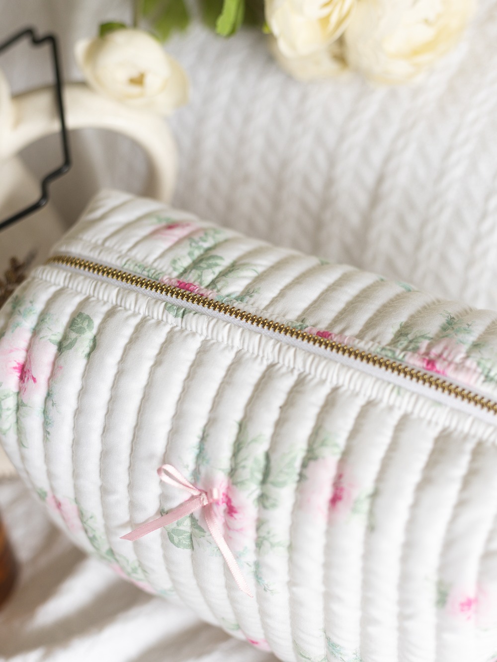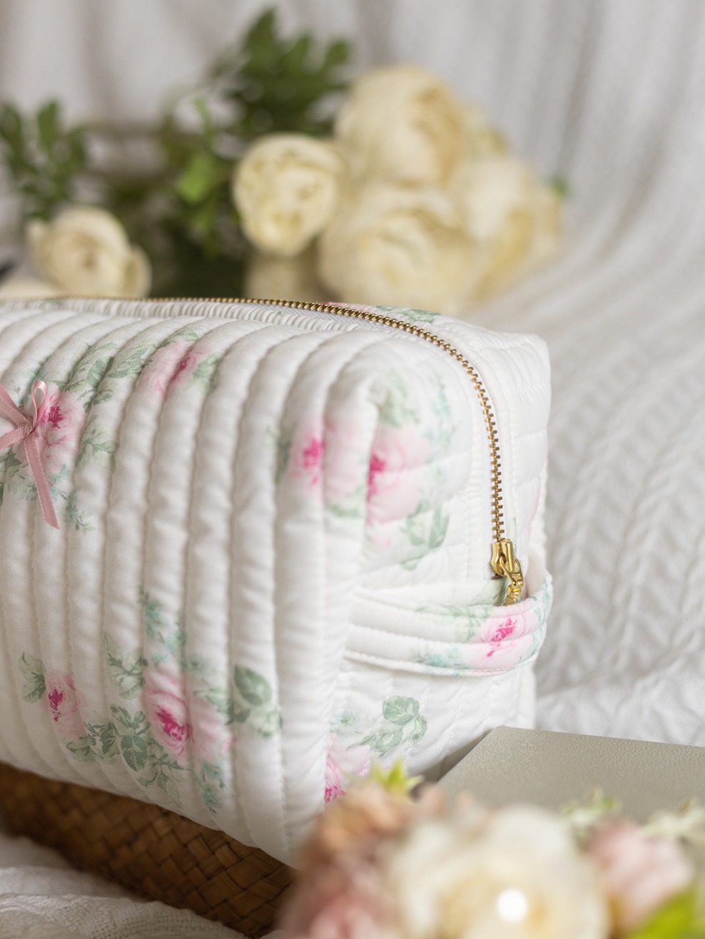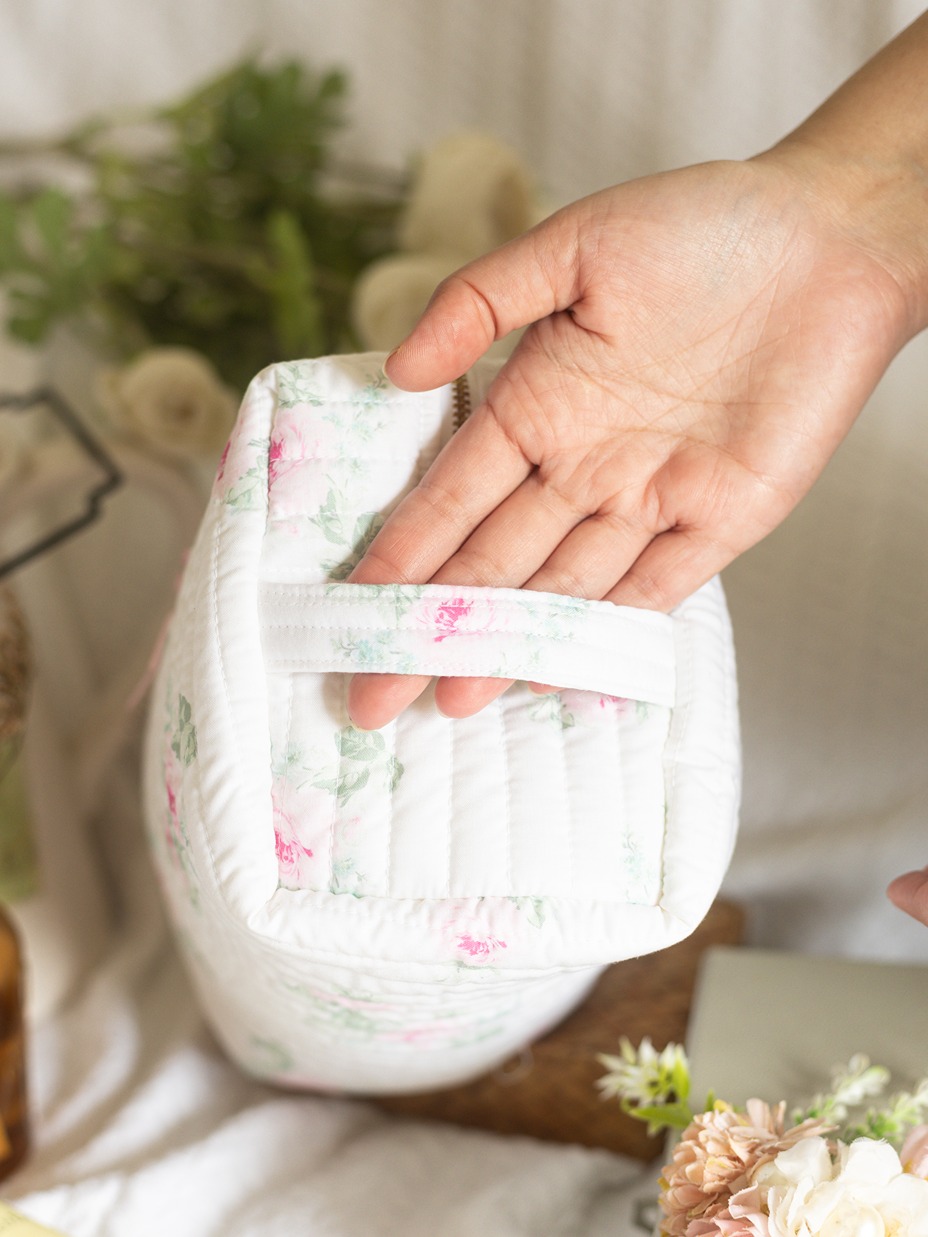 - This pouch is lightly quilted and comes with smaller compartments inside for better organising small items.