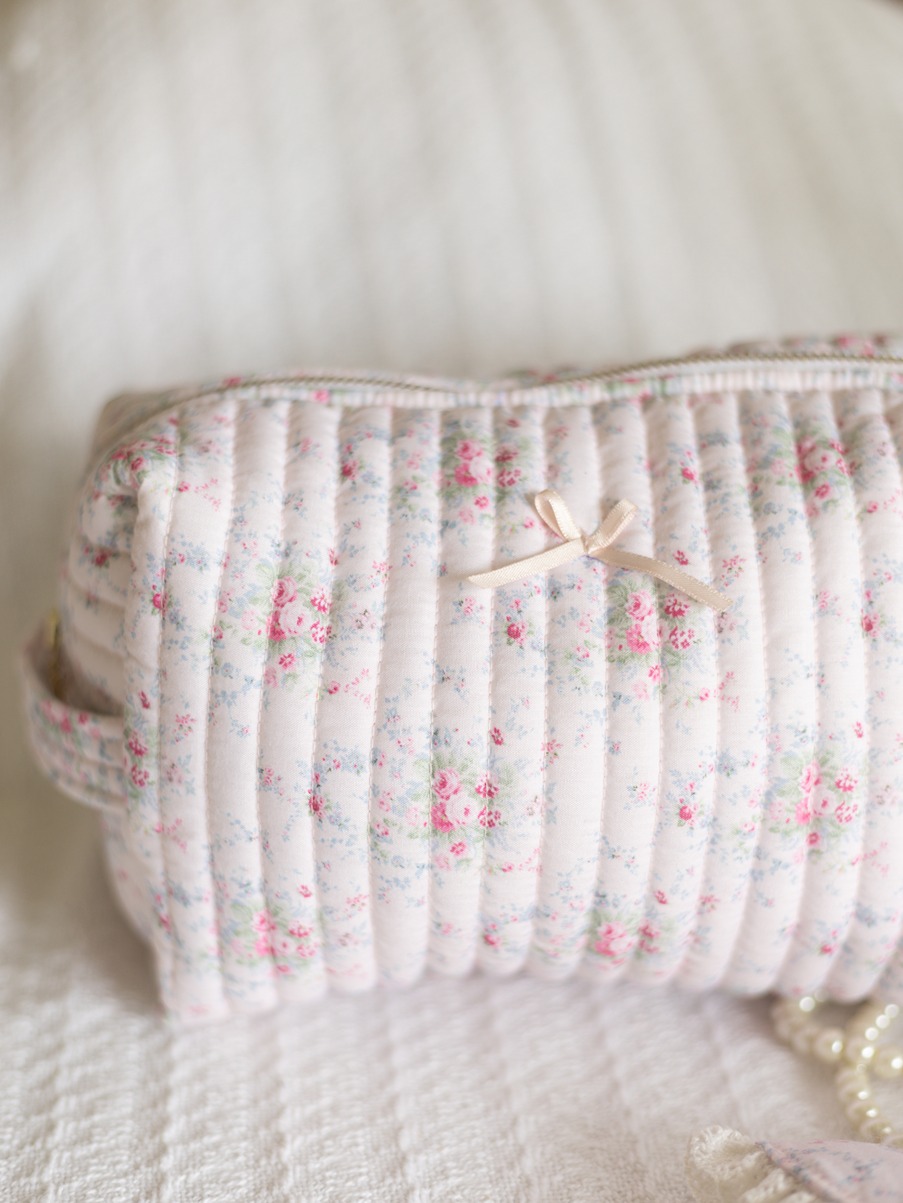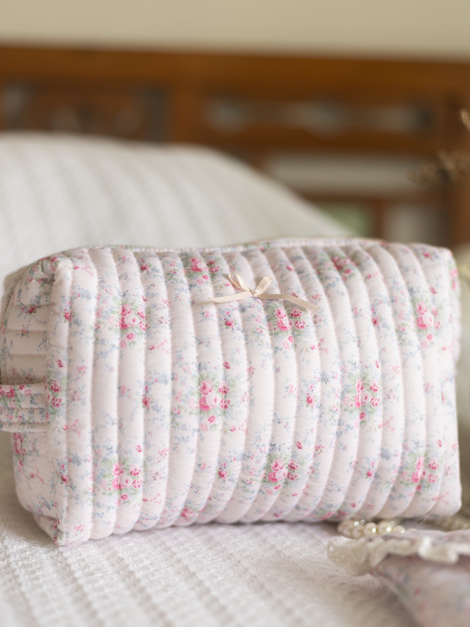 Quilted Multipurpose Pouch / Cosmetic Kit - Pink Floral (Large size: 9" length x 4" width x 5" height)
