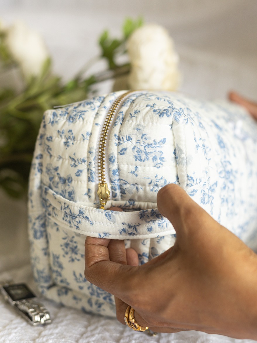 - This pouch is lightly quilted and comes with smaller compartments inside for better organising small items.