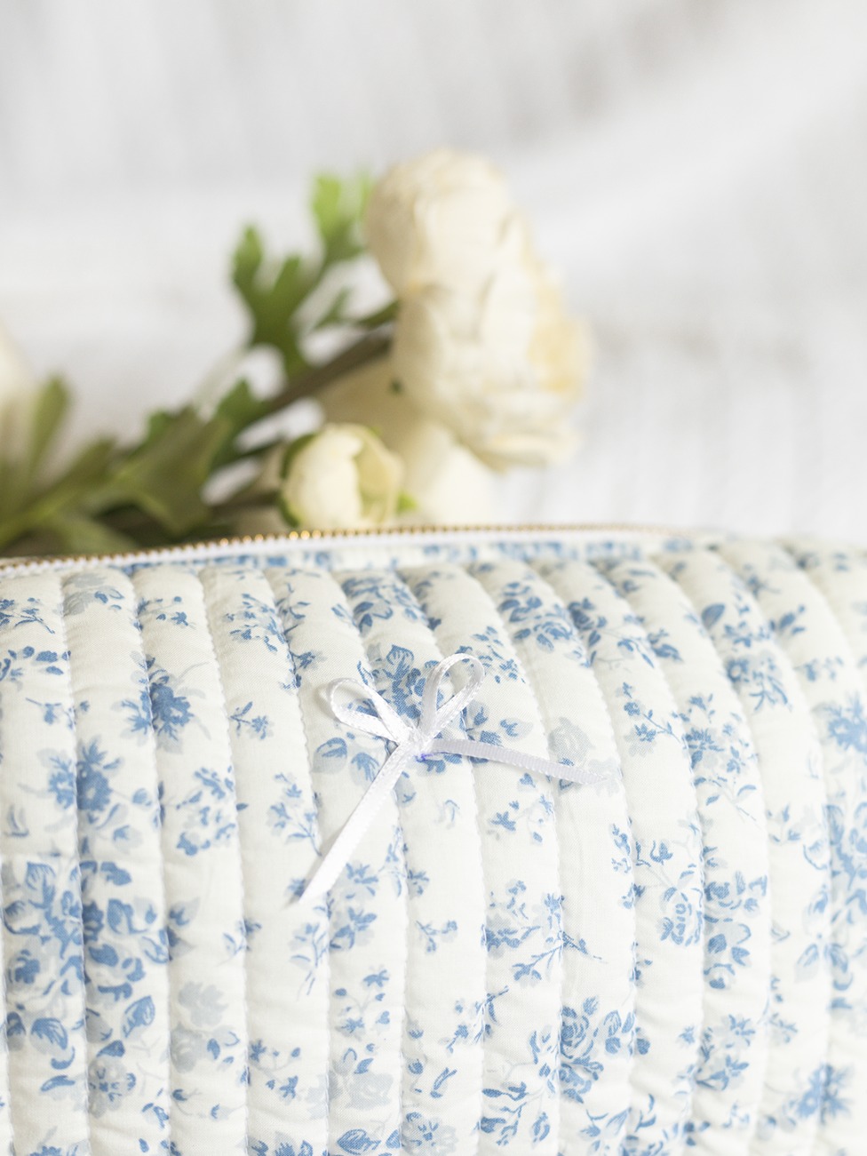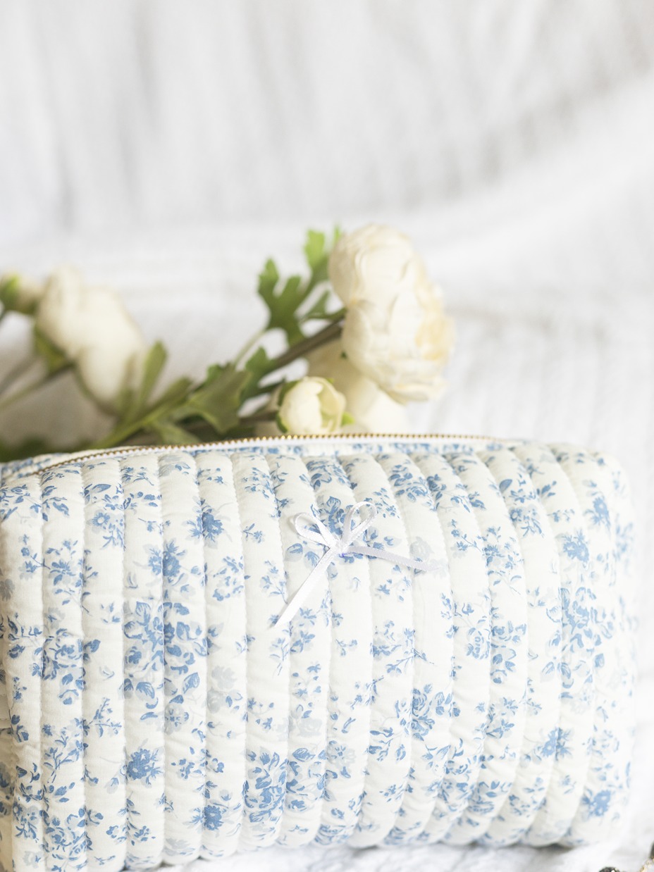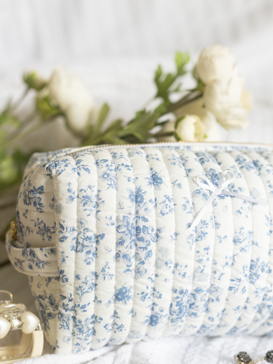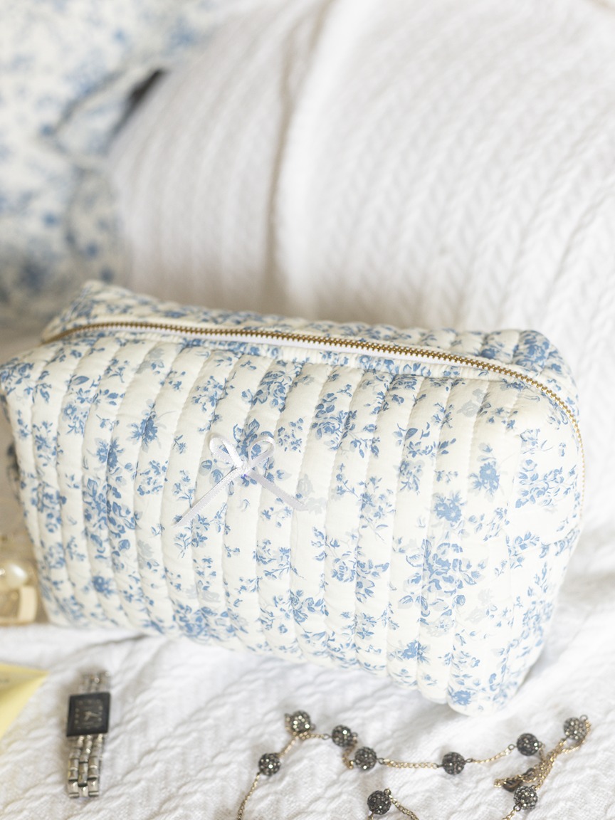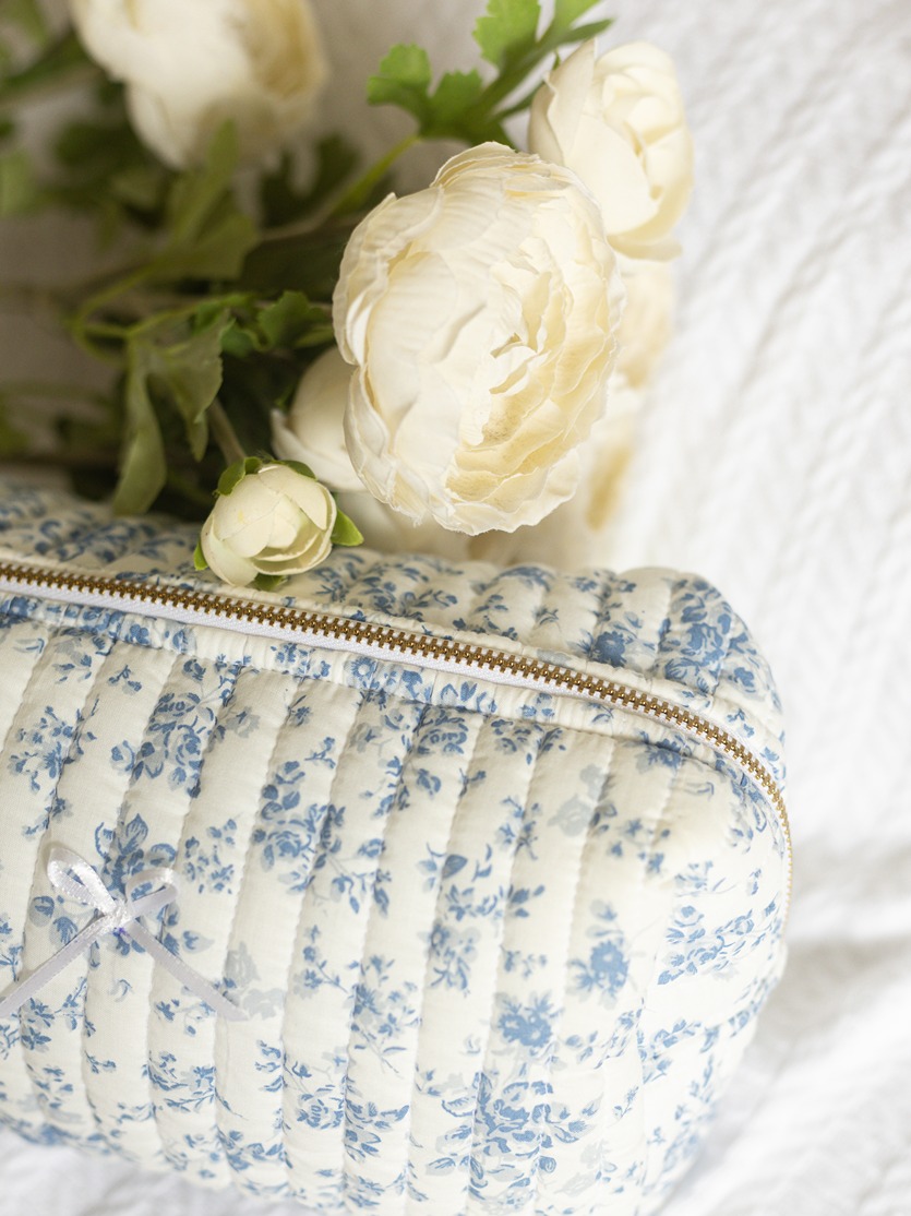 Quilted Multipurpose Pouch / Cosmetic Kit - Whispering Blue Florals (Large size: 9" length x 4" width x 5" height)