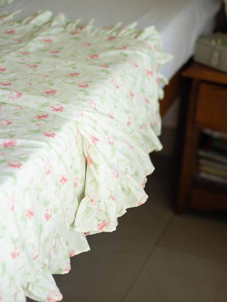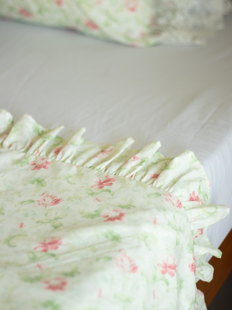 This set inlcudes: Duvet Cover in green floral with ruffles on top edge and a pair of matching Pillow Covers with intricate lace detailing.