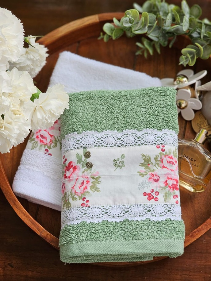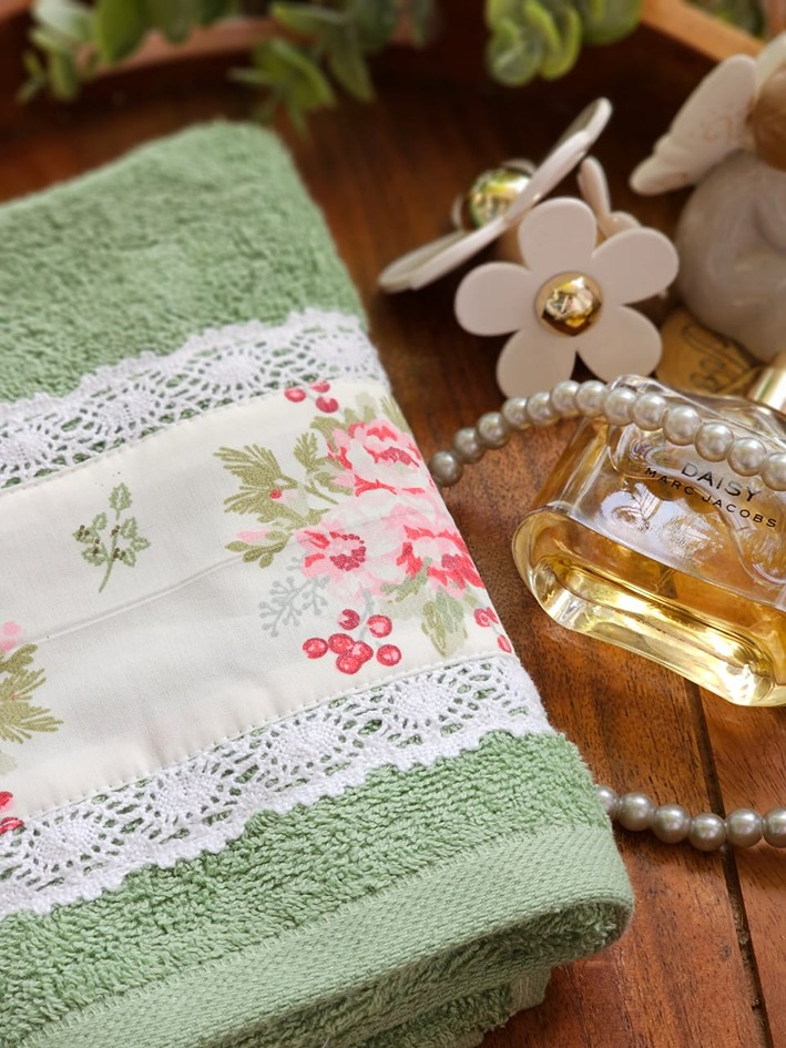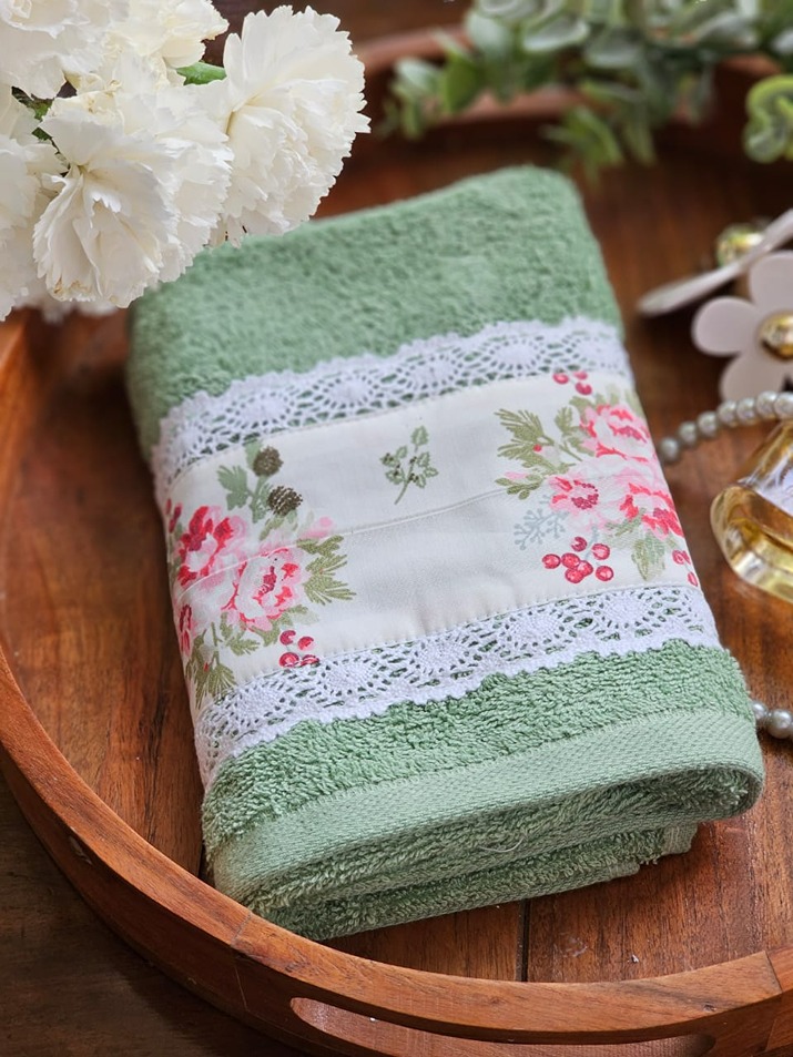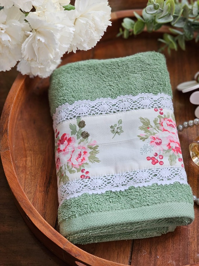Soft cotton hand towel with floral and lace detailing on one end of the towel.