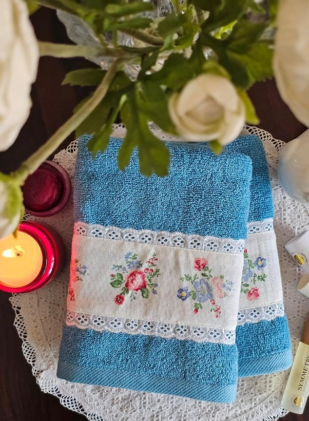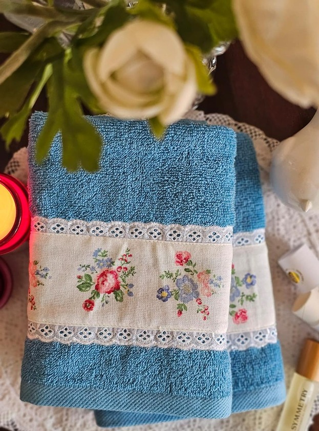 Soft cotton hand towel with floral and lace detailing on one end of the towel. Ultra Soft & Plush Feel, Light Weight, 2x Absorbency and Dries Fast Can be used in your designer bathroom near wash basin, guest bathroom, kitchen, for children's room or in office. It can also be used for gifting a lovely lady or a gentleman!