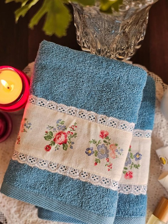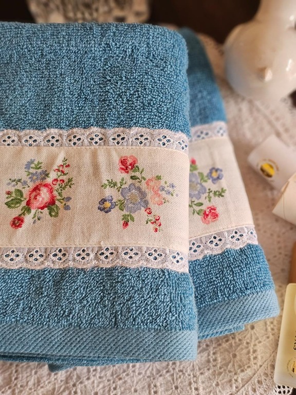 Description: Good quality towels with patchwork detailing. Care Instructions: Gentle machine wash recommended, Do Not Bleach, Iron On Low Heat Setting (not on laces)
