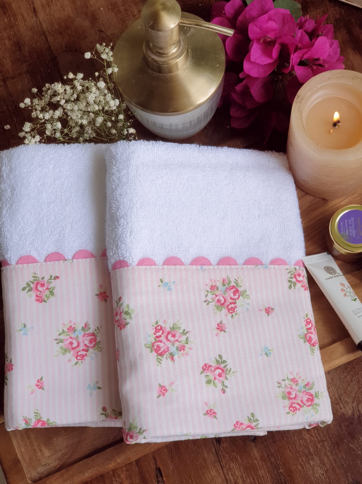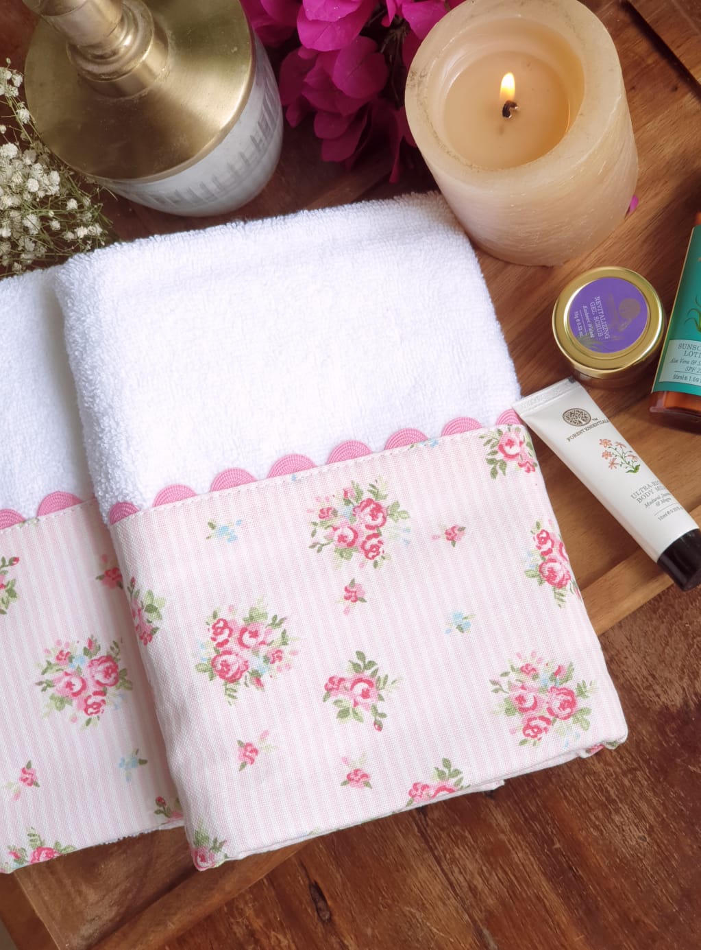 Single Hand Towel - White with pink themed floral and ric-rac lace detailing (Size: 16" x 23")