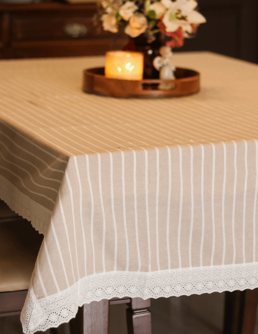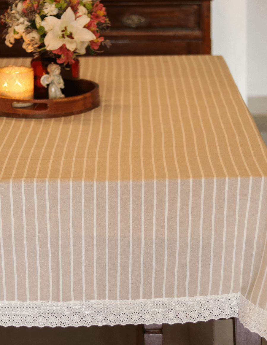 Table Cover - Classic beige - striped with cotton lace (4 Seater / 6 Seater / 8 Seater)